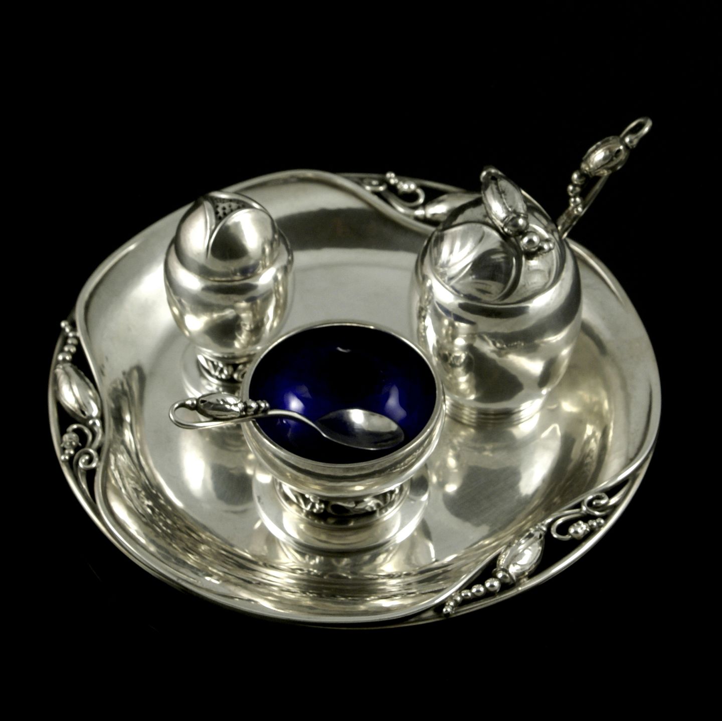 Bestående af bakke med peberbøsse & Saltkar med ske samt sennepskrukke med låg og ske.