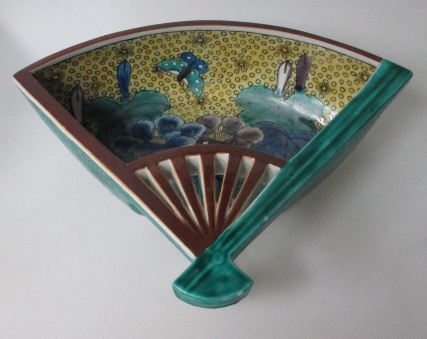 Japansk porcelæns fad, Kutani, 19. årh. Polykrom dekoration. Formet som vifte. Stemplet. 27 x 21 cm.