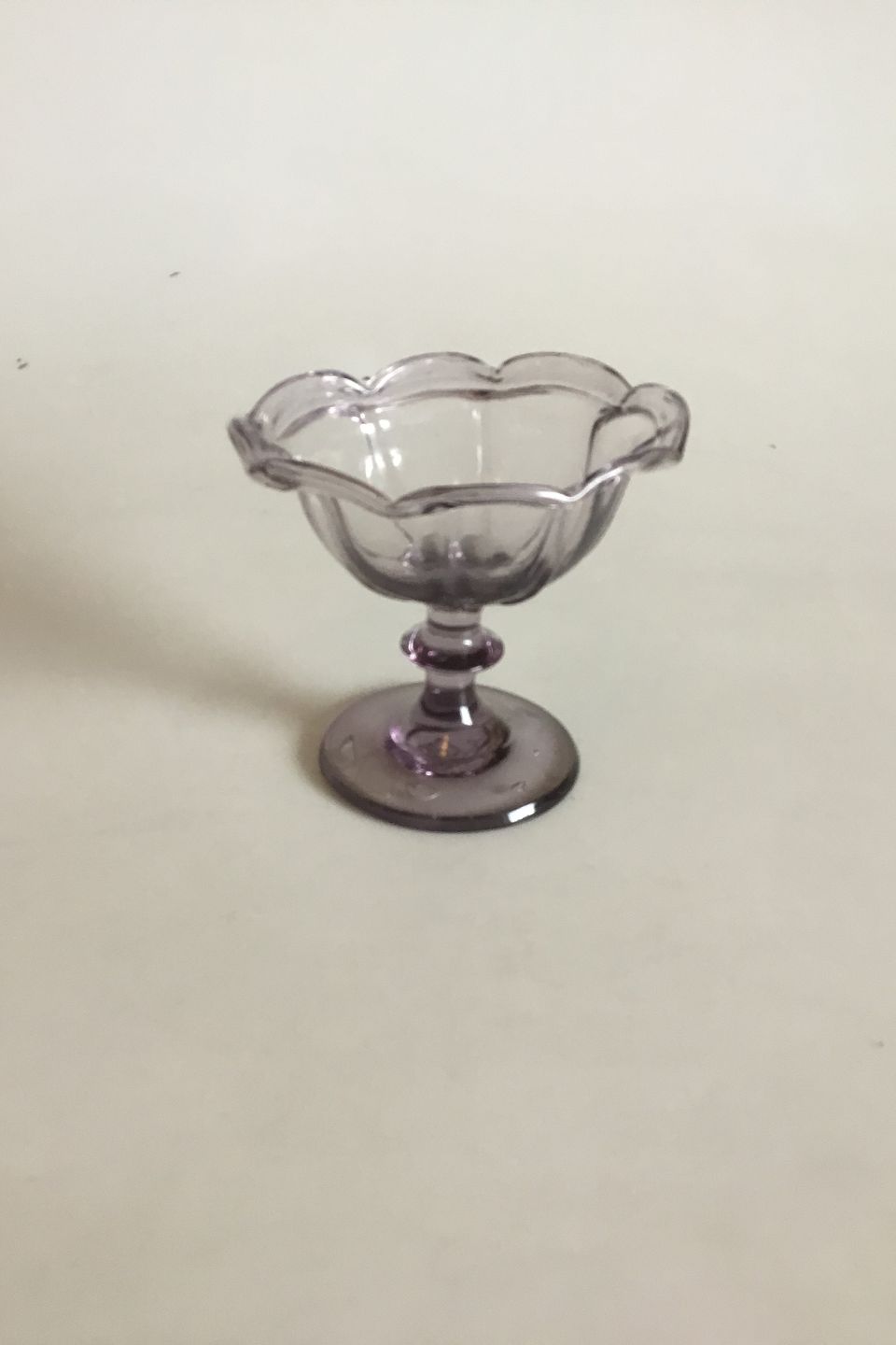 Lille glasopsats af lyslilla glas. Måler 11,5 cm