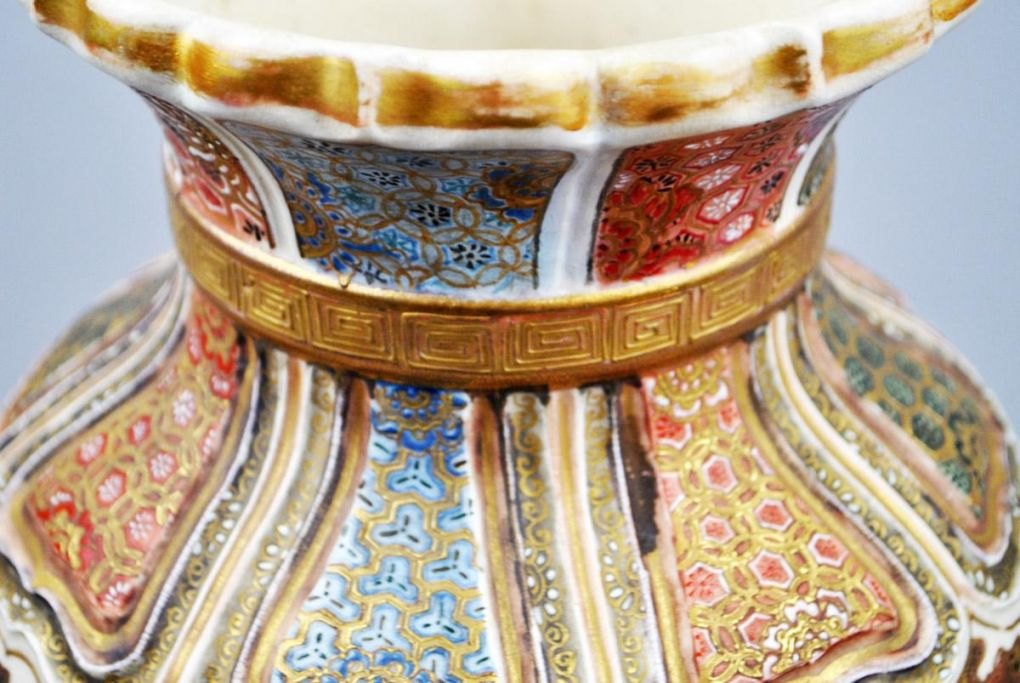Große wunderbar dekorierte Fayence Satsuma Vase, 19. Jh. Japan. Mit Reliefdekorationen. Polycom Dekoration mit zahlreichen Vergoldungen. Dekorationen in Form von Kriegern, etc. Höhe: 40,5 cm.