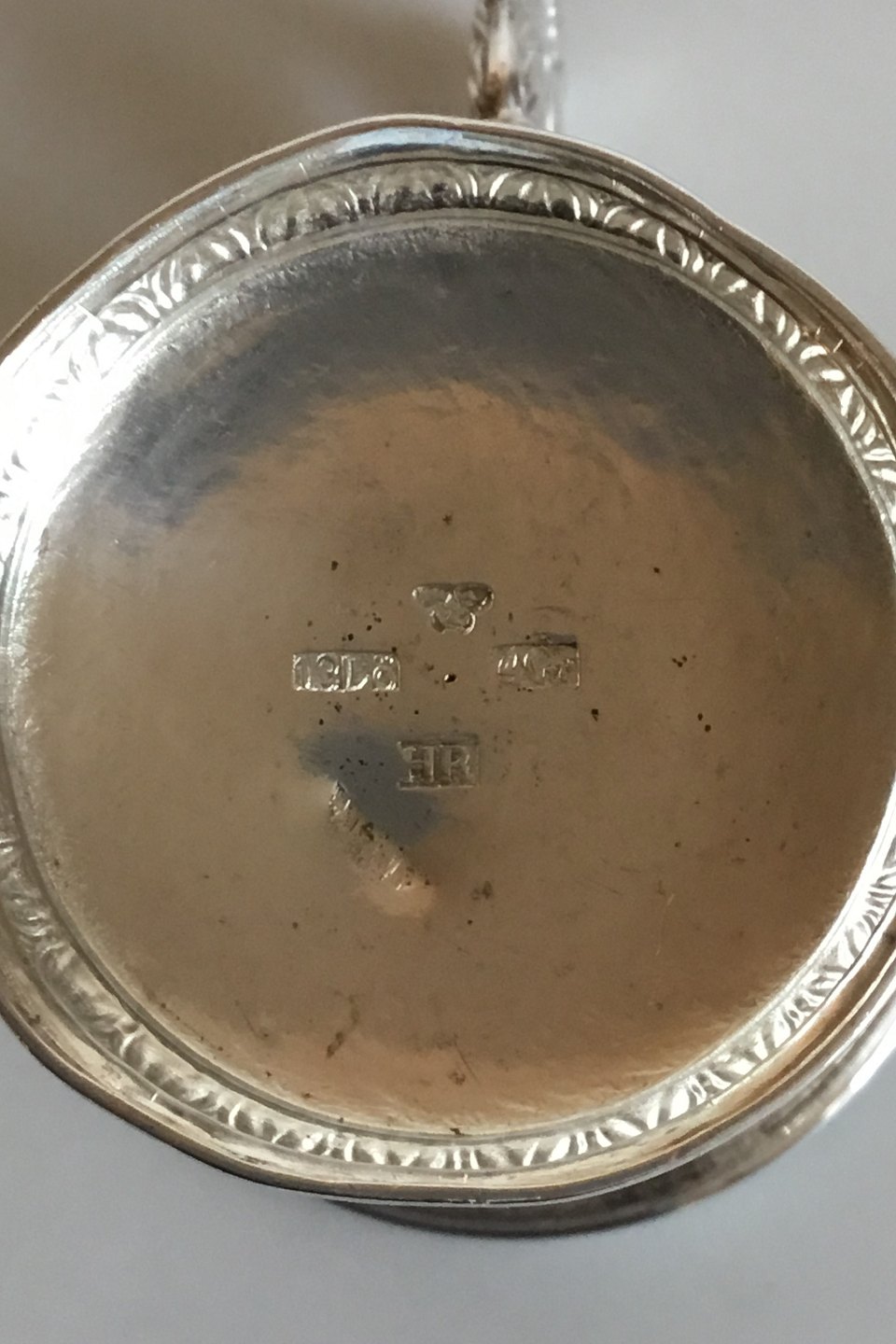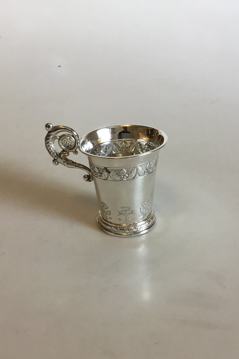 Lille Sølvbæger med hank. Måler 7,8 cm. Vejer 49 gram