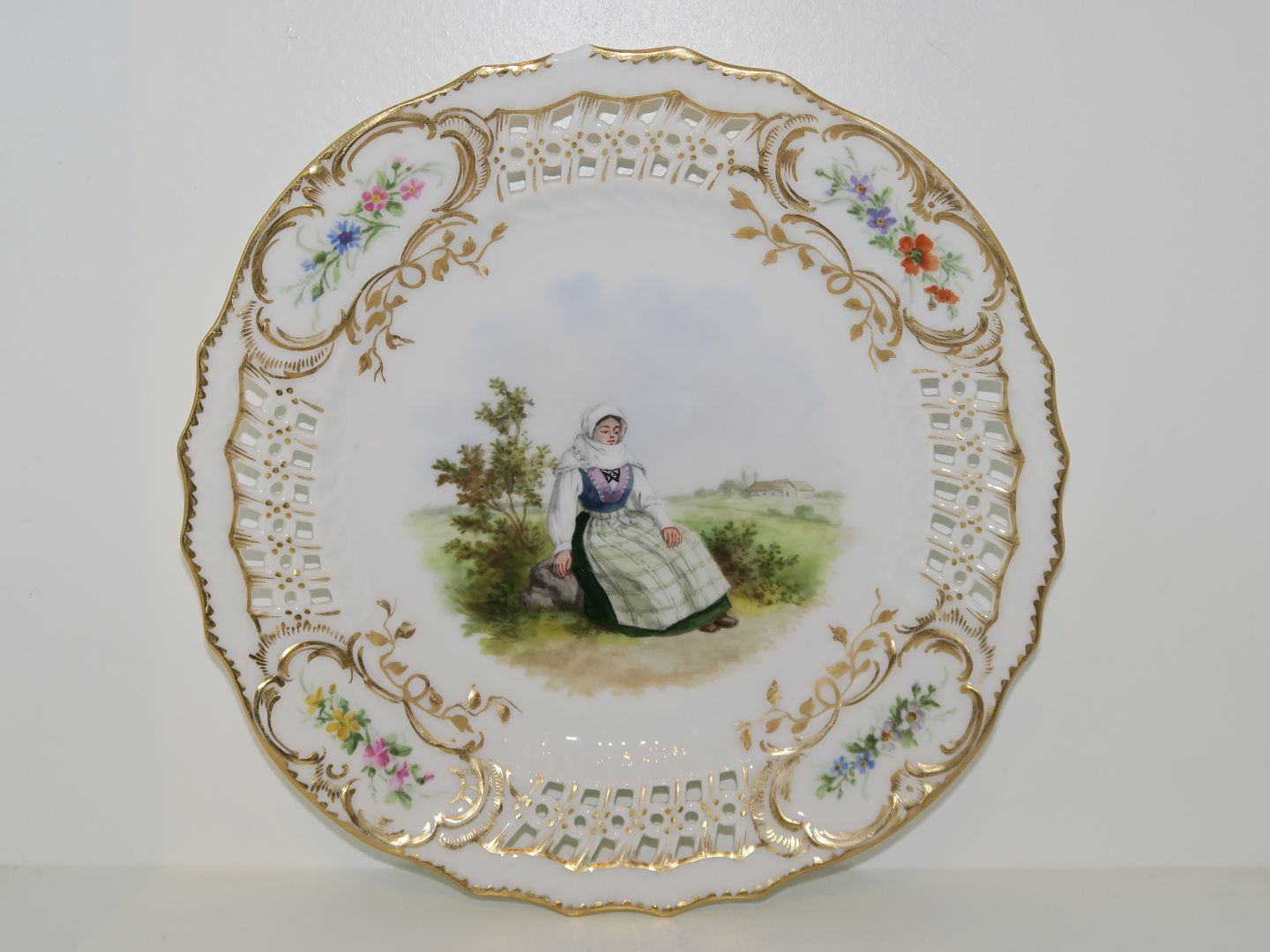 Royal Copenhagen sjælden tallerken med gennembrudt kant. Denne serie er dekoreret i høj kvalitet med danske egnsdragter.
