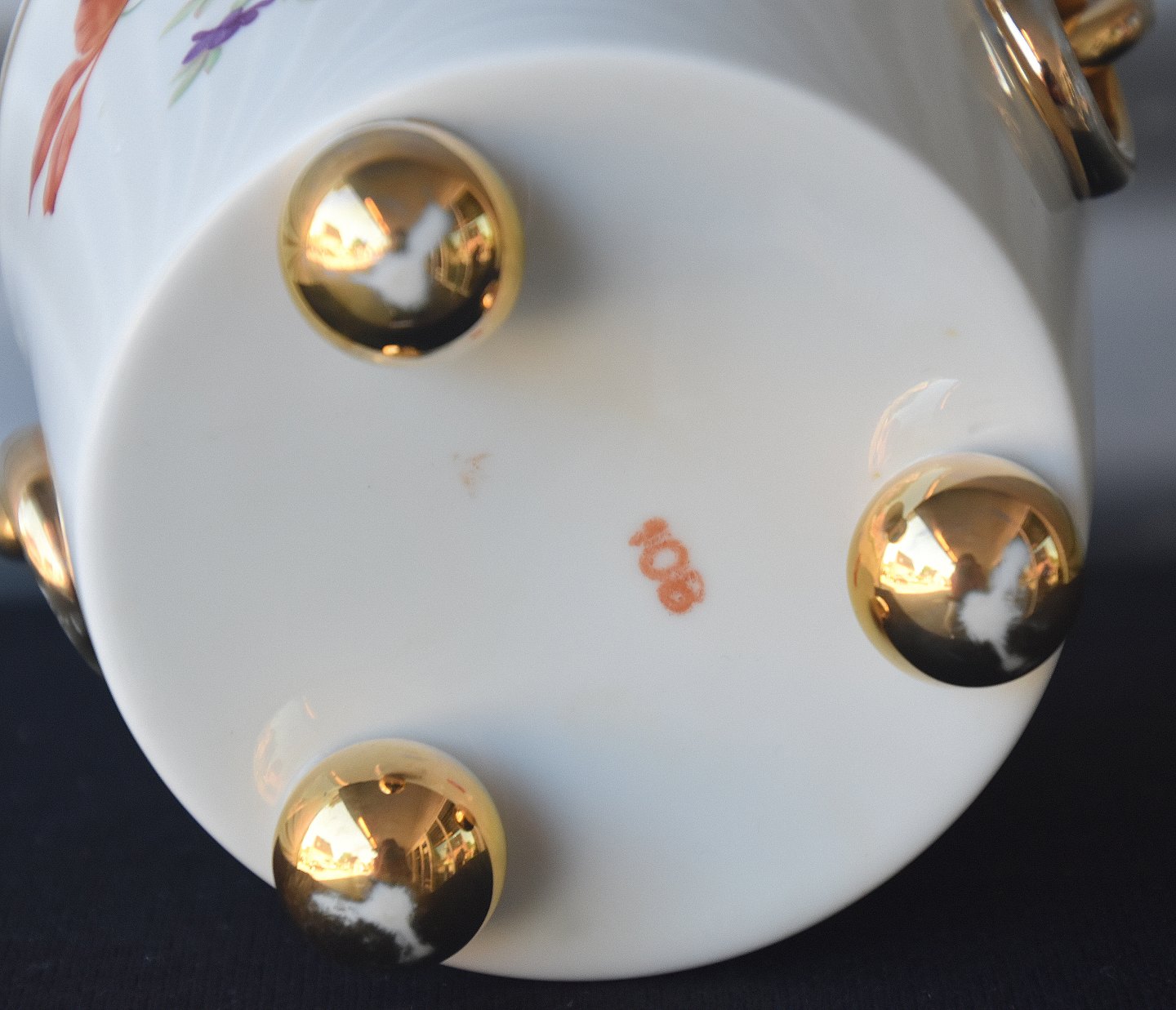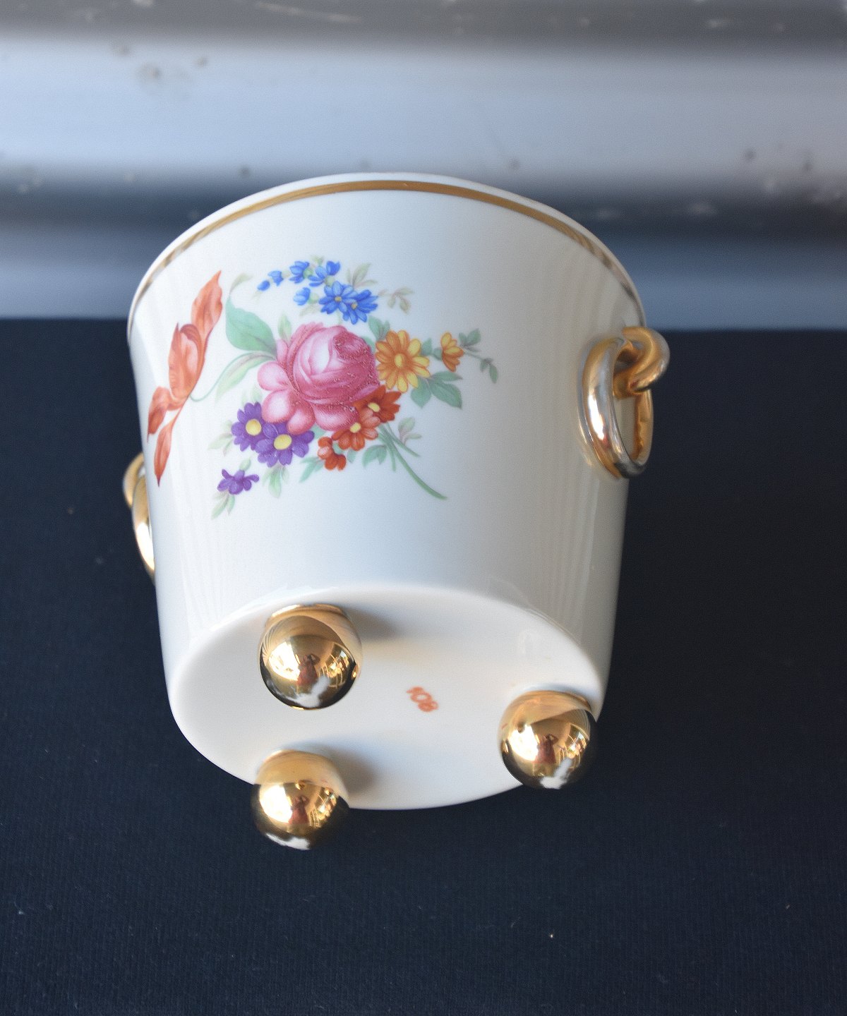 Urtepotte på guld kugle fødder. Urtepotteskjuleren er dekoreret med blomstermotiv i overførselsteknik, samt delvis forgyldning