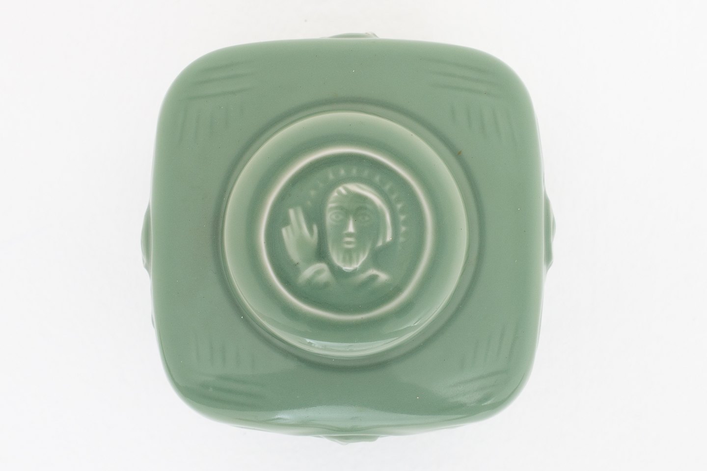 Lågkrukke i porcelæn m. grøn celadon glasur.