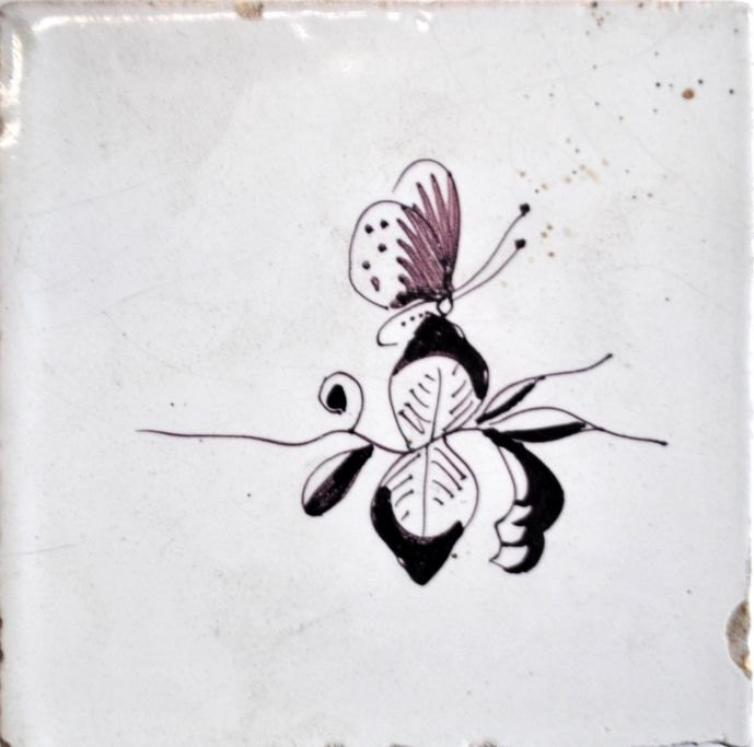 Fliesen, Fayence, "Schleswig Blume", "kleine Blume". Deutschland des 19. Jahrhunderts. 13 x 13 cm. Preis: Pro. Stück: 300, - kr. Derzeit: 9 Stk. auf lager.