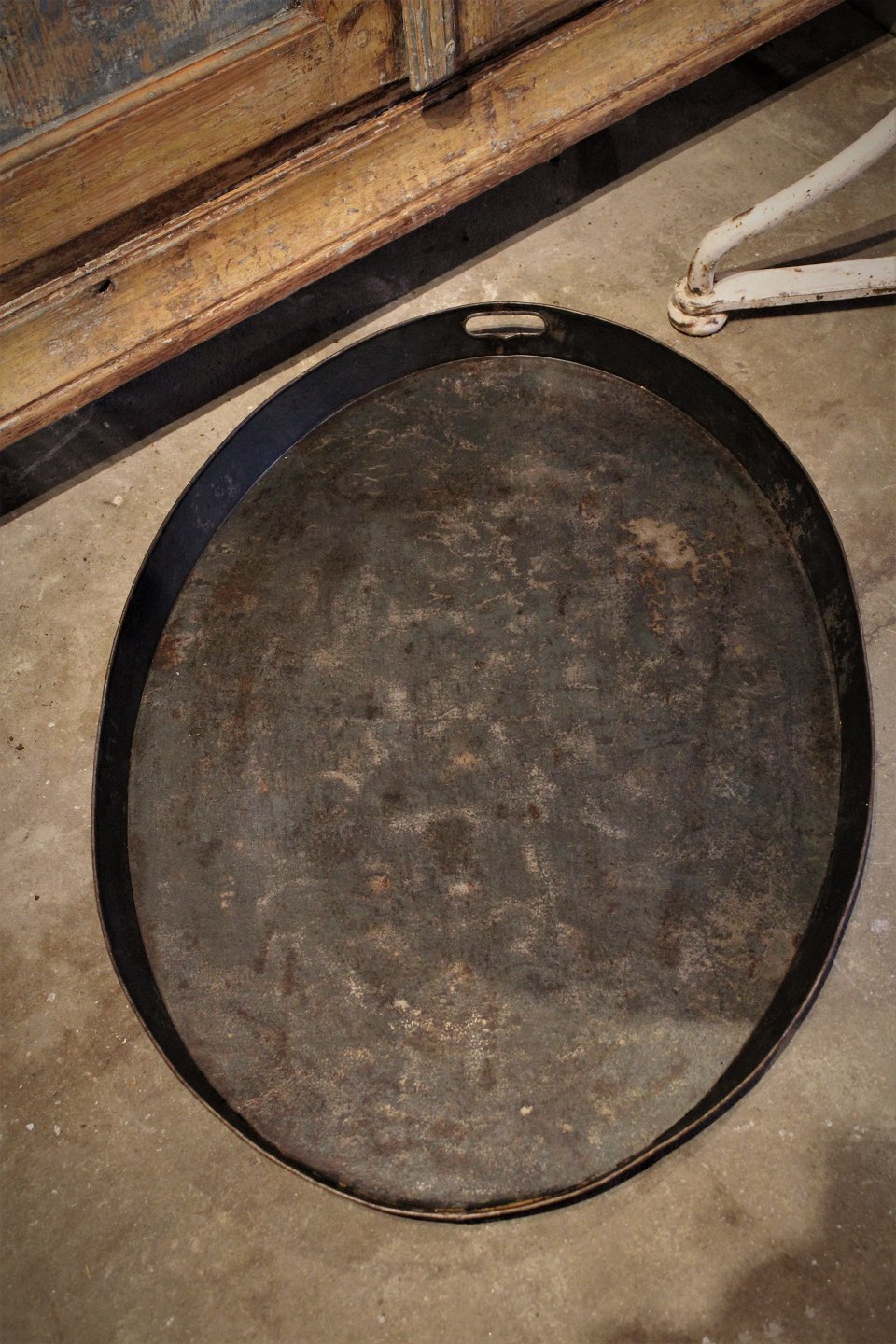 Gammel rå Fransk oval bakke i afpudset jern og med en super flot patina.