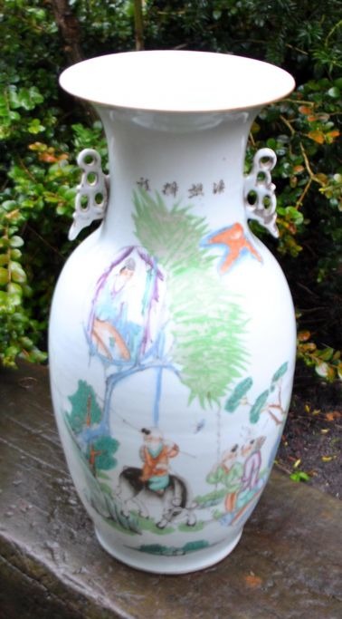 Stor kinesisk porcelæns gulvvase, 19. årh. Bemalinger i form af mennesker i landskab. Med tekster. Med to hanke. Med tidligere forgyldning. H.: 43,5 cm.