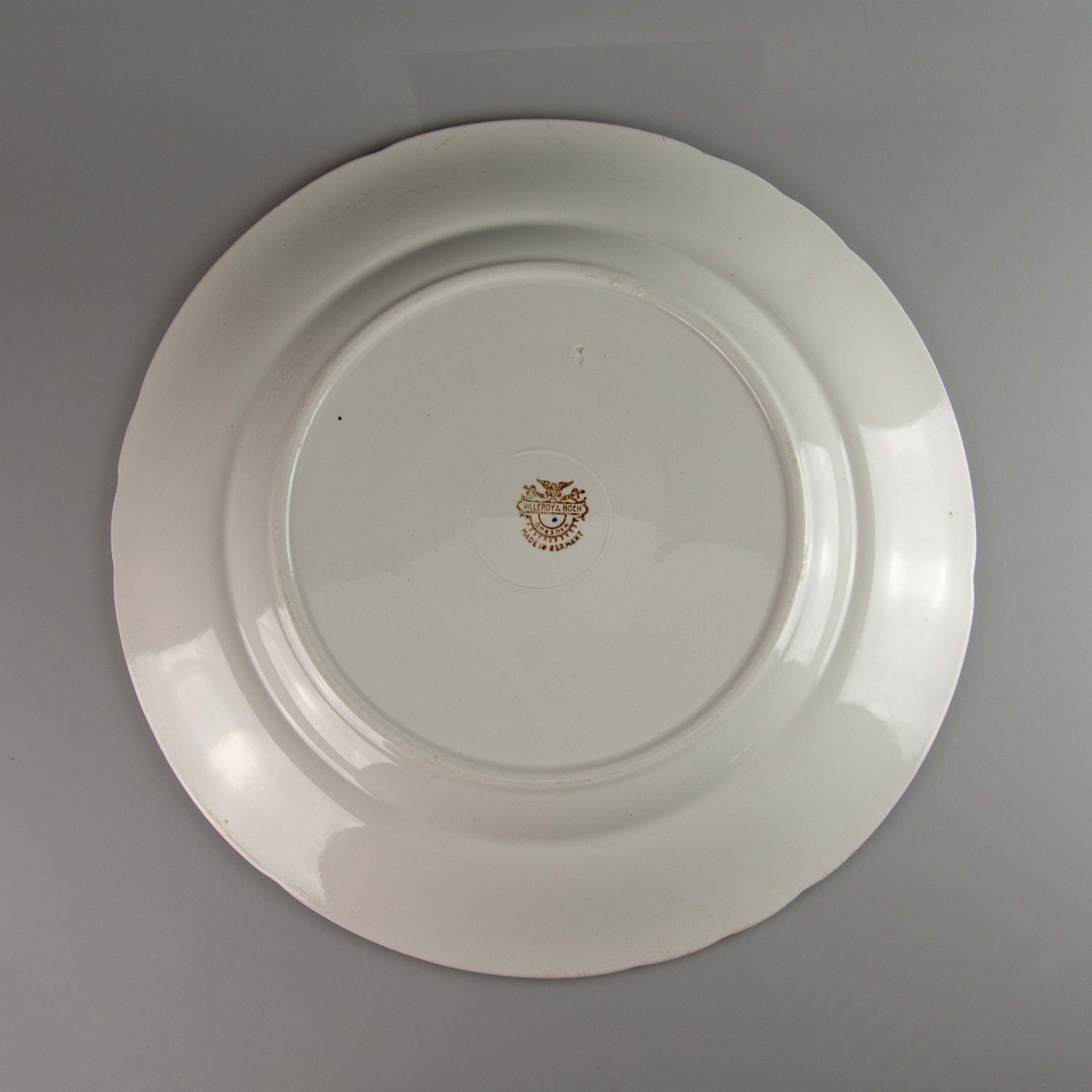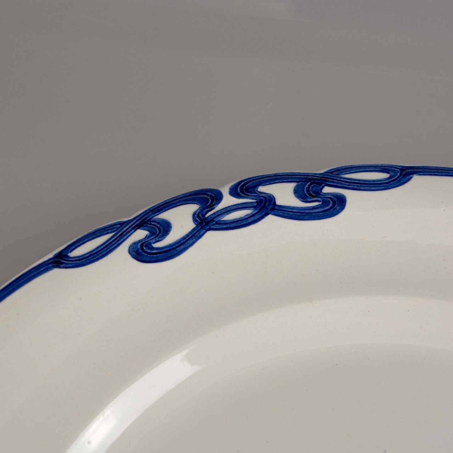 Fad i hvid fajance med dekoration af blå abstrakt mønster langs kanten.