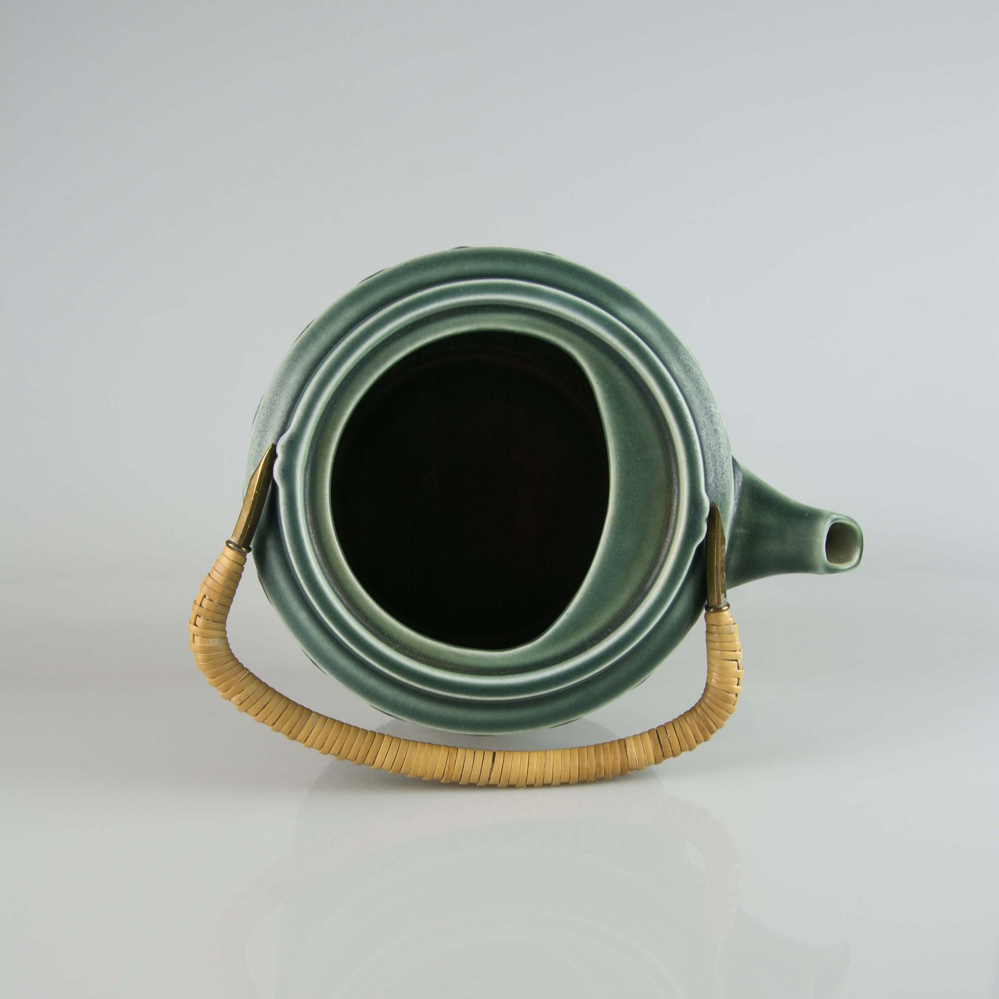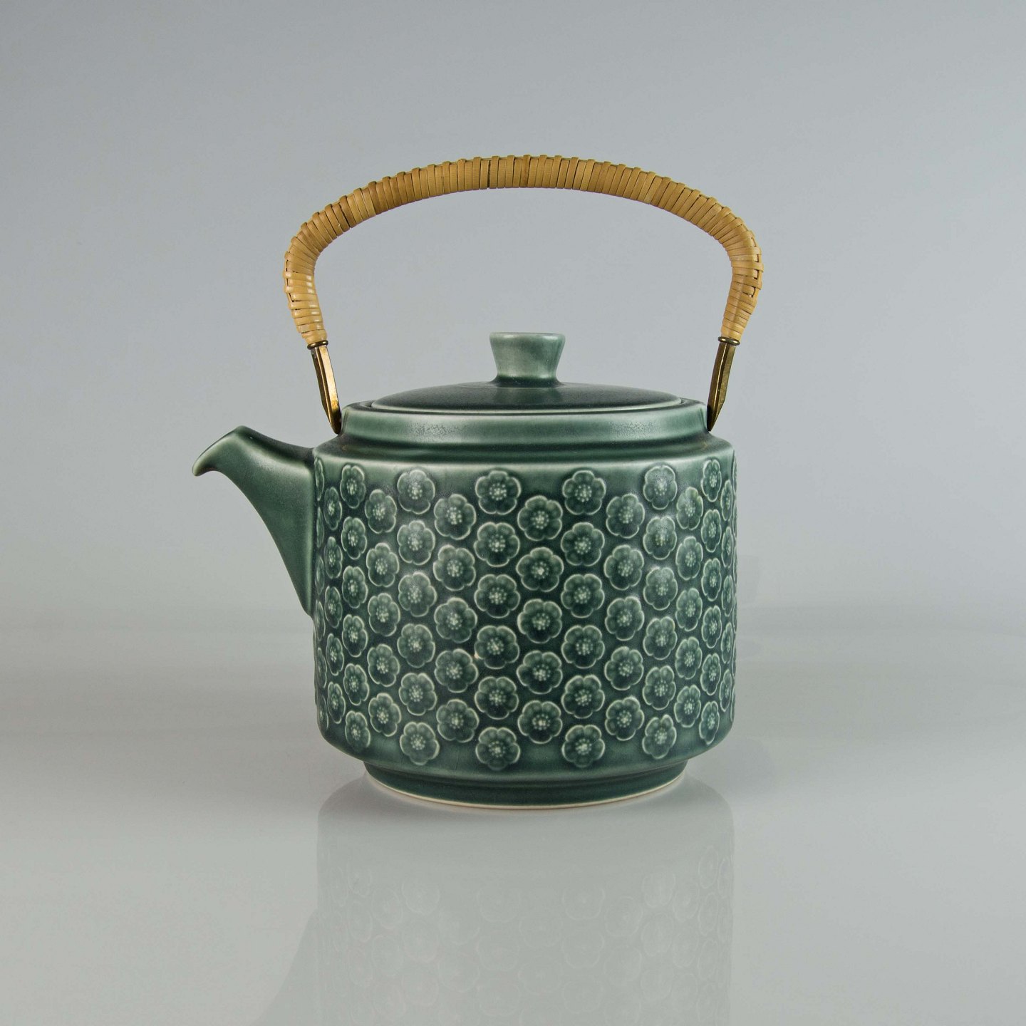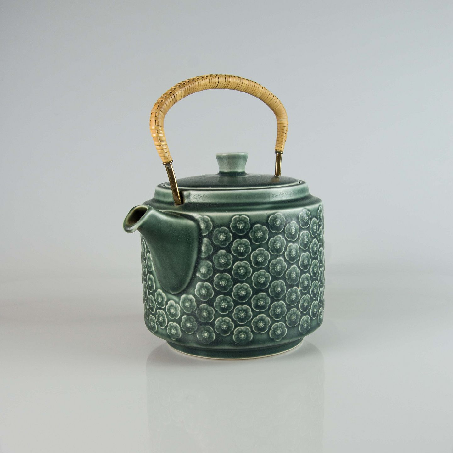 Stel i blågrøn stentøj med blomster motiver og håndtag i messing beklædt med bambusflet.