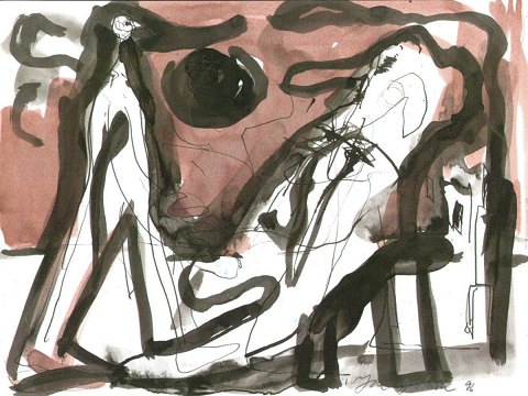 Gislason, Jon (1955): Komposition mit zwei Personen. Aquarell / Tusche auf Papier. Signiert:Jon Gislason 96 (1996). 27 x 36 cm.