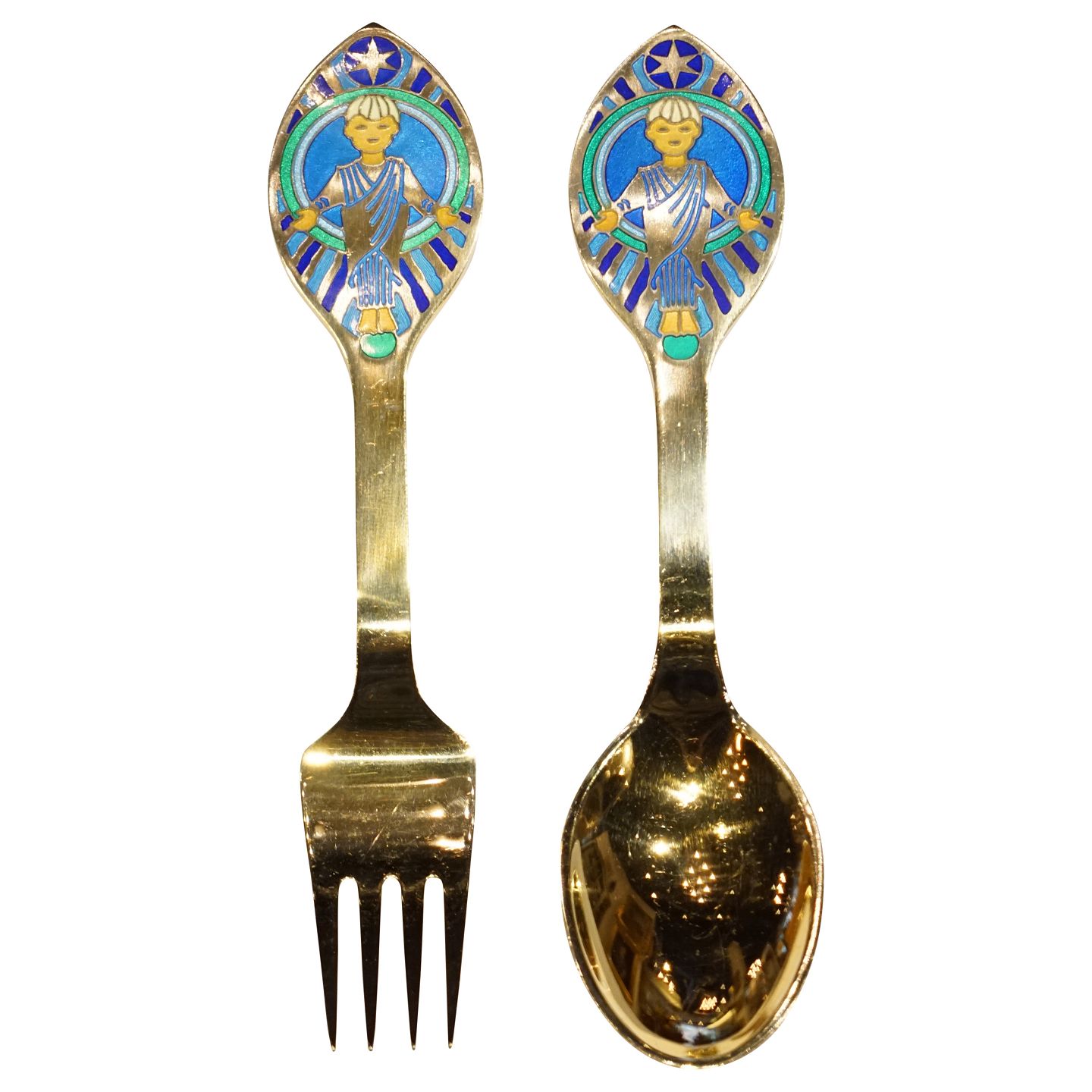 Juleske og julegaffel af forgyldt sterling sølv prydet med emalje.