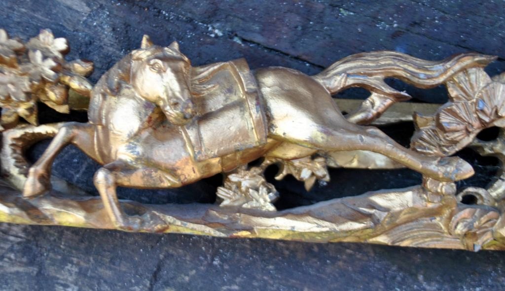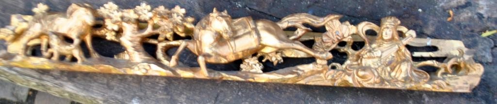 Chinesischer vergoldeter Holzschnitt mit Ziege mit Kind, Pferd und spielender Frau. 19. Jahrhundert. Länge: 48 cm. H: 6,8 cm.