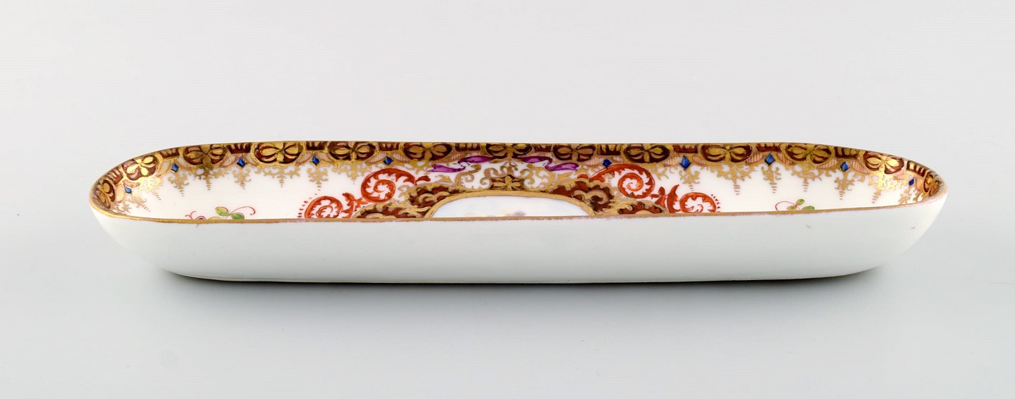 Text zugänglich auf Dänische: Antik Meissen pennebakke i håndmalet porcelæn med købmænd og gulddekoration. 1800-tallet.