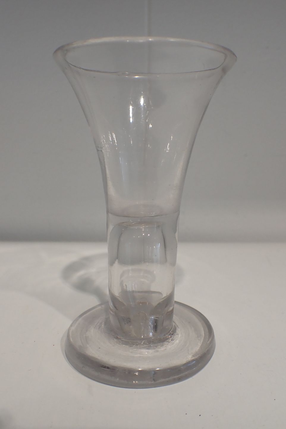 Text zugänglich auf Dänische: Hollandsk geneverglas - trompetformet med hul stilk. 1800 tallet. Højde: 12 cm. Diameter foroven: 6,6 cm. Med tidstypisk kraftig slid på fod og med en lille flis i kant.