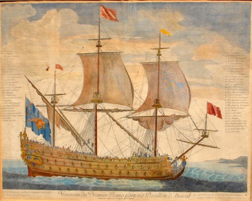 Französischer Künstler (17. Jahrhundert): Vaisseau du Premier Rang, portant Pavillon d'Admiral. Handkolorierter Kupferstich. 44 x 53 cm.
