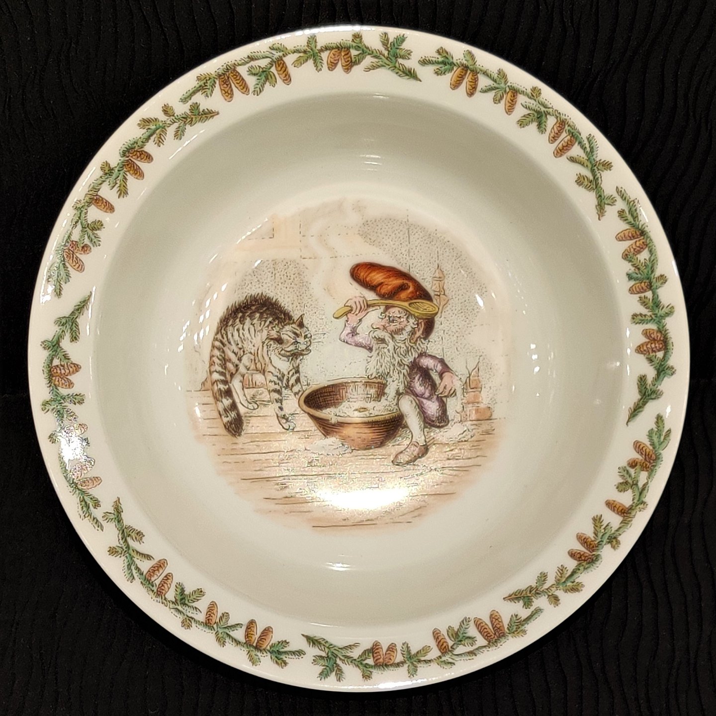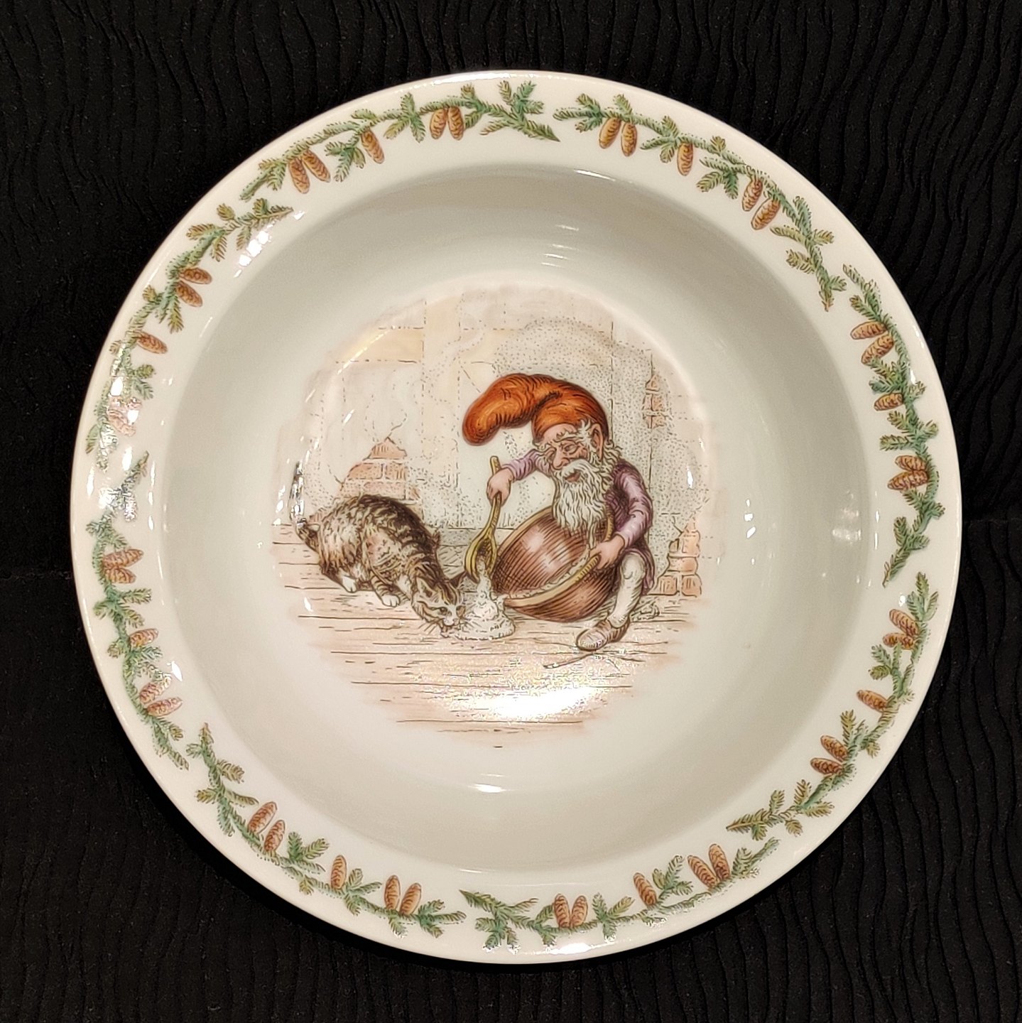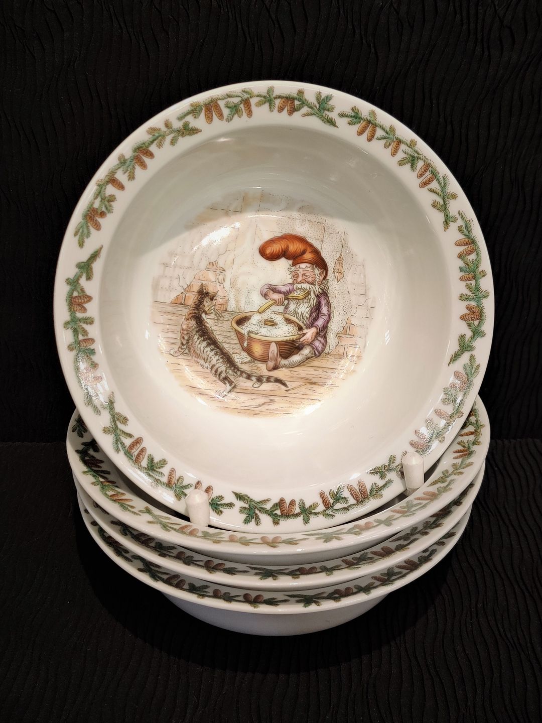Harald Wiberg for Royal Copenhagen; Juleservice. Grødskåle med julemotiver, nisse, kat og risengrød, omkranset af granguilande. Diam. 15,8 cm. Sælges stykvis.