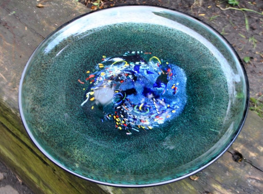 Große handgemachte Kosta Boda Schale aus mehrfarbigem Glas, Nr. 7079321, Schweden des 20. Jahrhunderts. Meteorlinie. Aufgeführt von Bertel Vallien. Gestempelt. Durchmesser: 37,5 cm. Wirklich schöner Zustand!