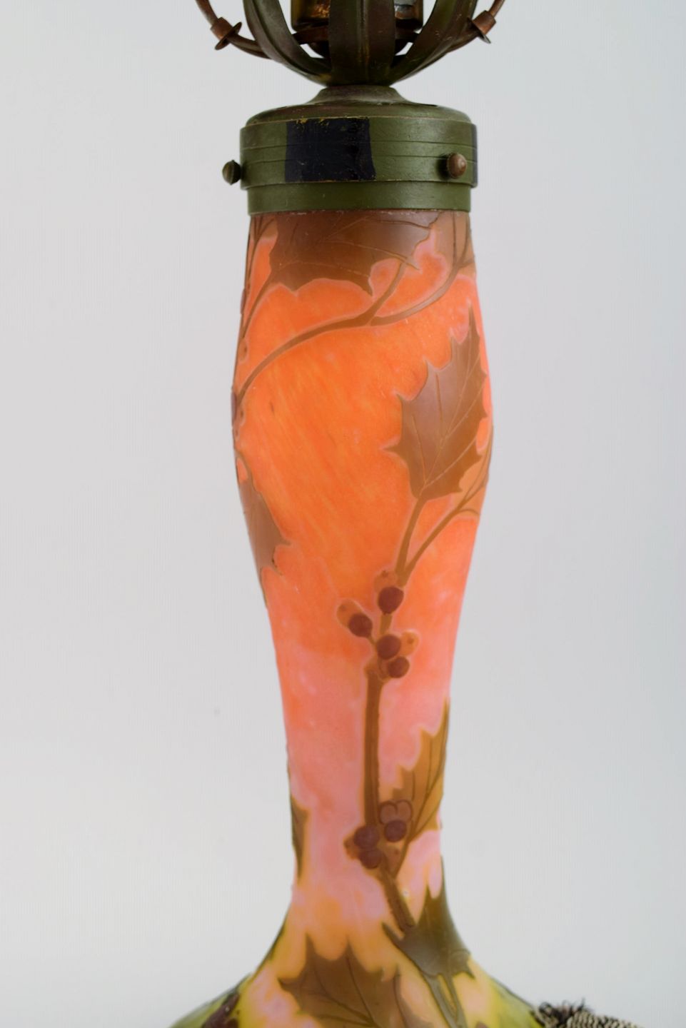 Text zugänglich auf Dänische: Legras, Frankrig. Stor art nouveau bordlampe i mundblæst kunstglas med overfang udskåret med motiver af blomster og bladværk. Tidligt 1900-tallet.