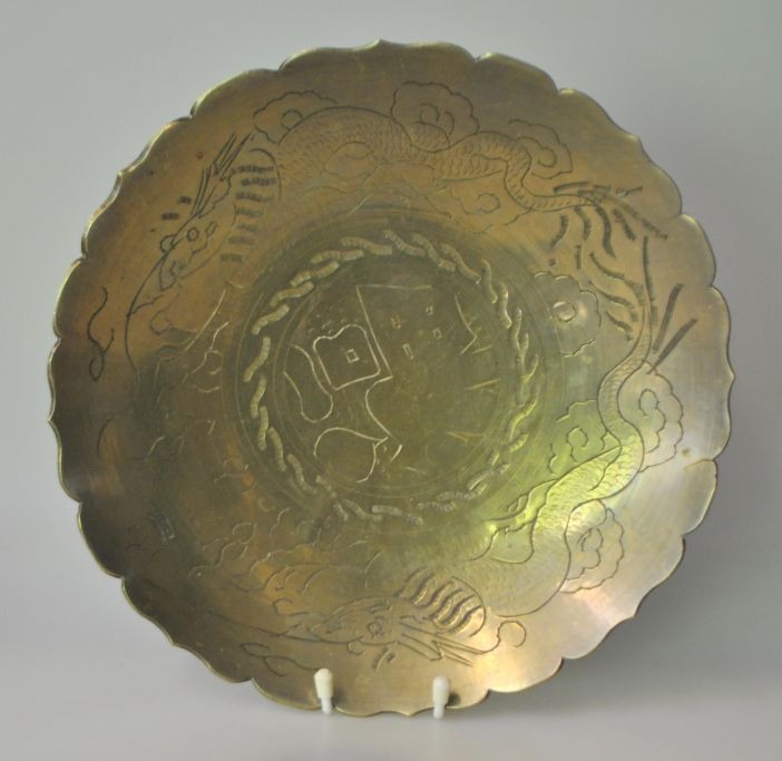 Chinesische gehämmerte Messingschale 19./20. årh. Mit Drachen dekoriert. Gewellter Rand. Dm.: 28 cm Gestempelt: China.