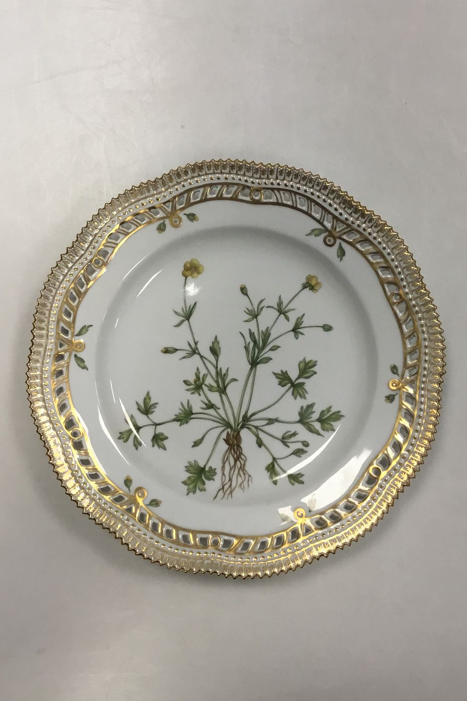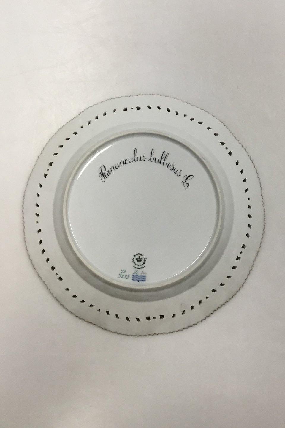Royal Copenhagen Flora Danica tallerken med gennembrudt kant No 20/3553. Latinsk navn: Ranunculus bulbosus L. Måler 25,5 cm(10 3/64 in.)