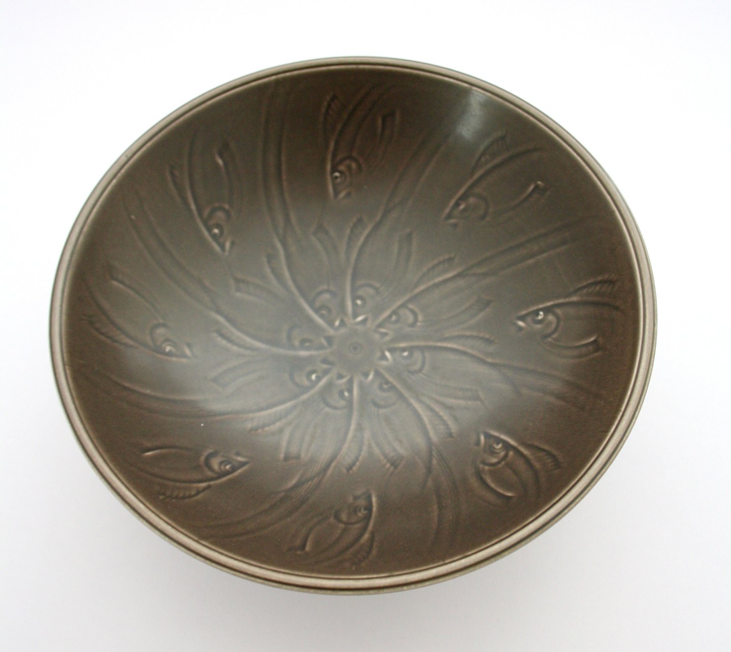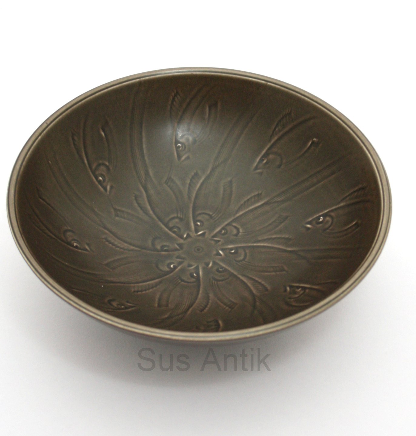 Text zugänglich auf Dänische: Aluminia, Solbjerg kunststengods fra 1934 designet af Nils Thorsson. Brun skål med fisk indridset i selve originalformen. Glasuren er mat. Formnr. 1585. Diameter 18 cm. Højde 6,3 cm.