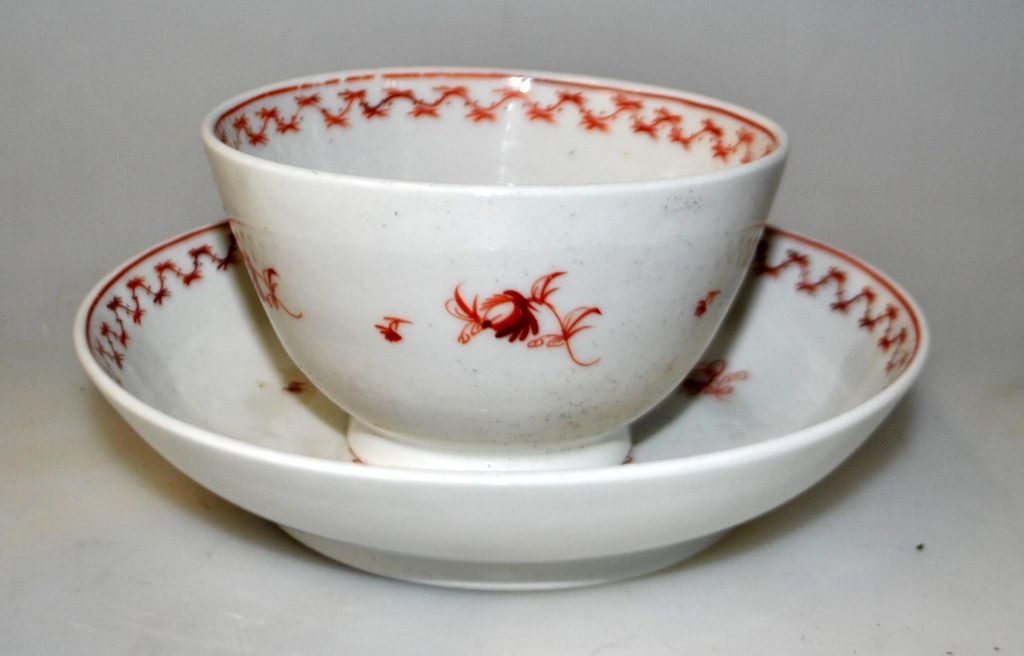 Chinesische Tasse mit Untertasse, 19. Jh. Handgemalte Dekorationen mit geometrischen Mustern und roten Blumen. H.: 5,5 cm. Durchm. Untertasse: 13,8 cm.