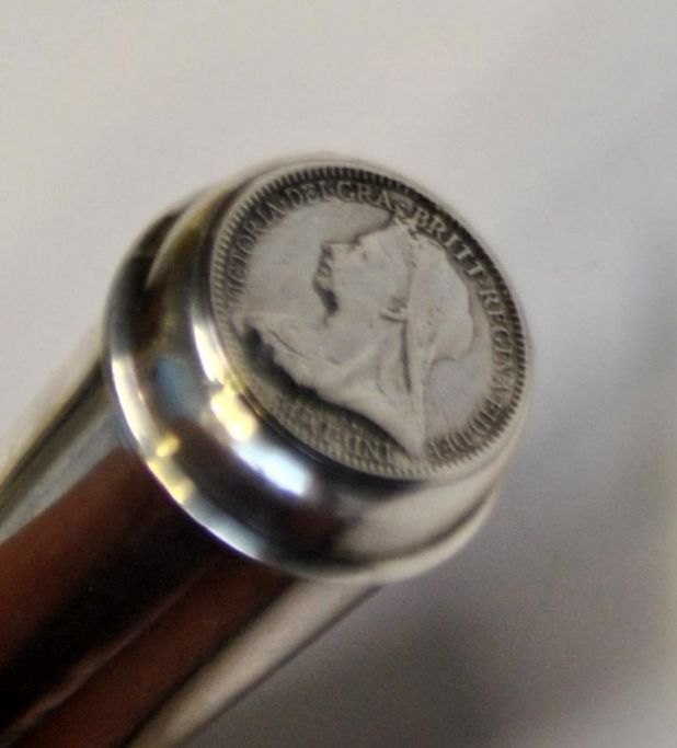 Engelsk vinagrette i sølv med mønt som låg, 19. årh. Konisk. Med øsken. Længde.: 6,5 cm. Stemplet. Købt hos Drew & Sons, Picadilly Cirkus - stemplet herfor.