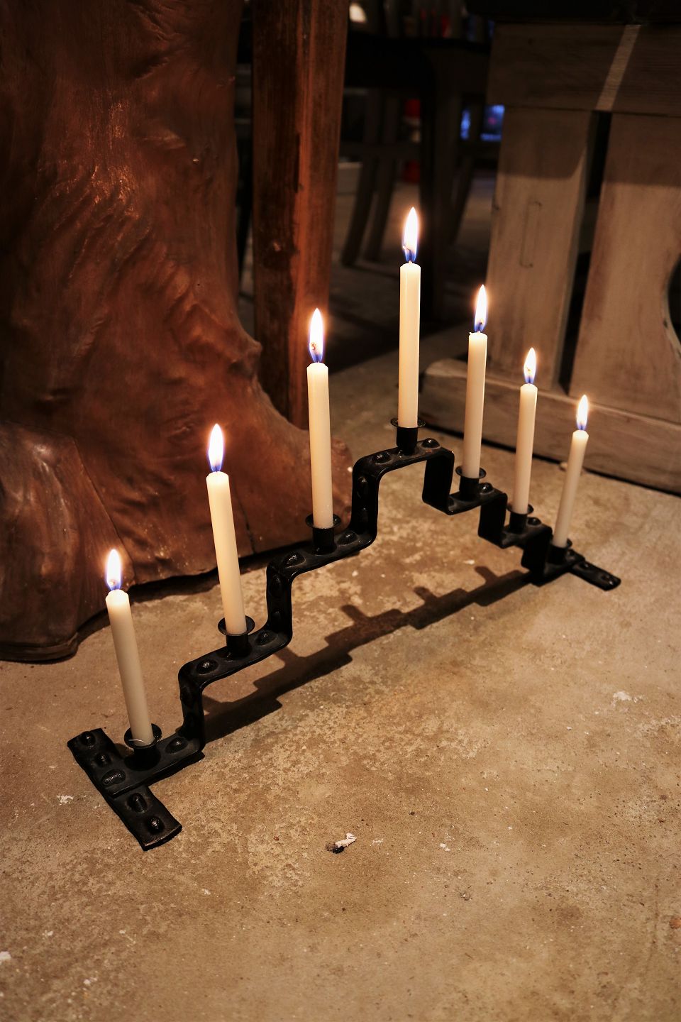 We offer a wide selection of old furniture with character, prism chandeliers and French church candlesticks.