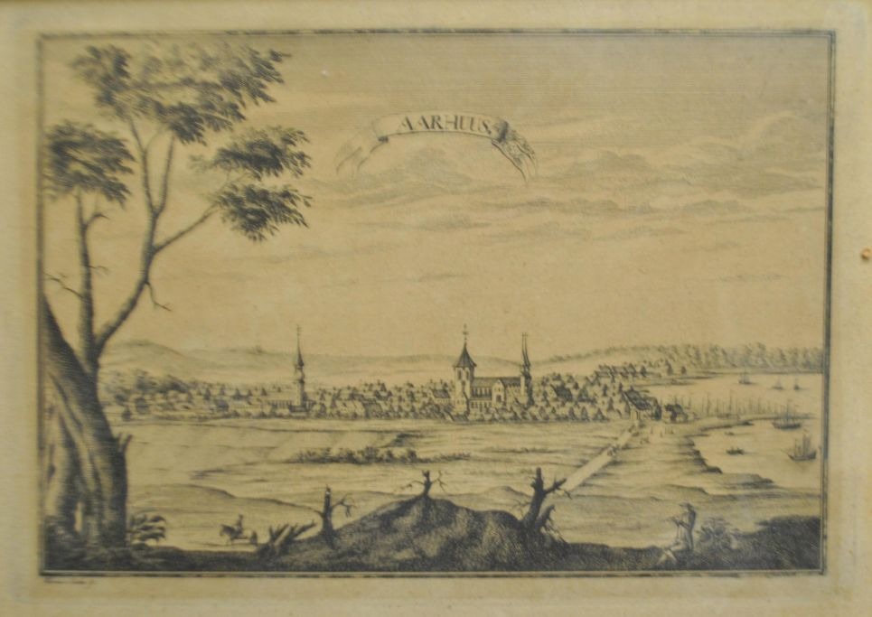 Aussicht über Aarhus. Der dänische Atlas. 1763 - 1783. Von Eric Pontoppidan, vol. 4. Aarhus von Süden aus gesehen. Ausgefürt von Alexia v. Lode. 17,5 x 25,5 cm.