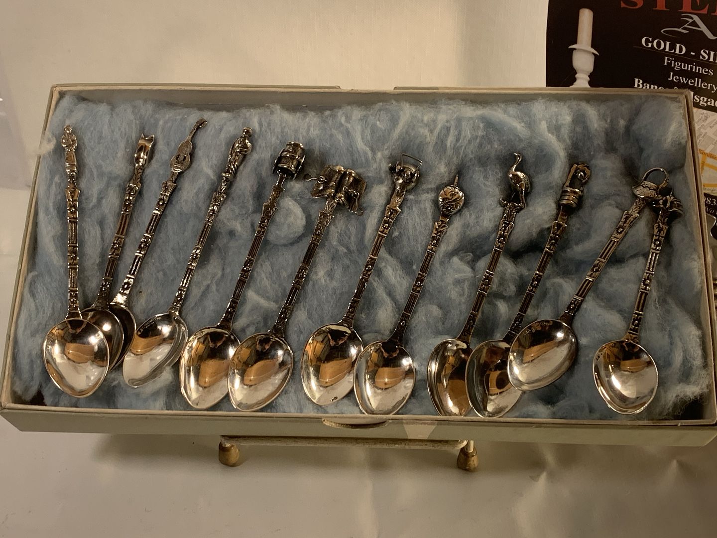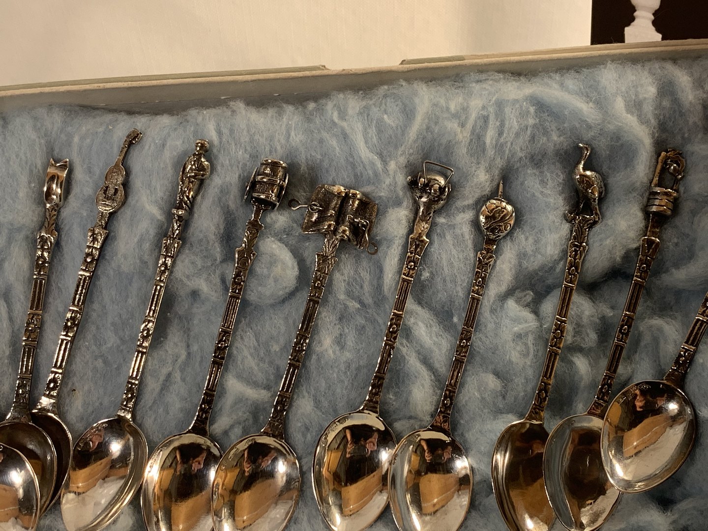 Silberner Kaffeelöffel Silber 925a Silber Silber: Lbo 12 Stück, jedes mit eigener Dekoration 1 EL. Maria mit Kindern.1. STCK. Eule.1 Stck. mit Gitarre 1.Stck. mit mann mit turban aladdin.1. Hestevogn1.stk bibel .1.stk. thekande.1.stk �ble.1.stk kalkun.1.stk. Begehren Feuer.1.Stk. Topf.1.St. das Essen.