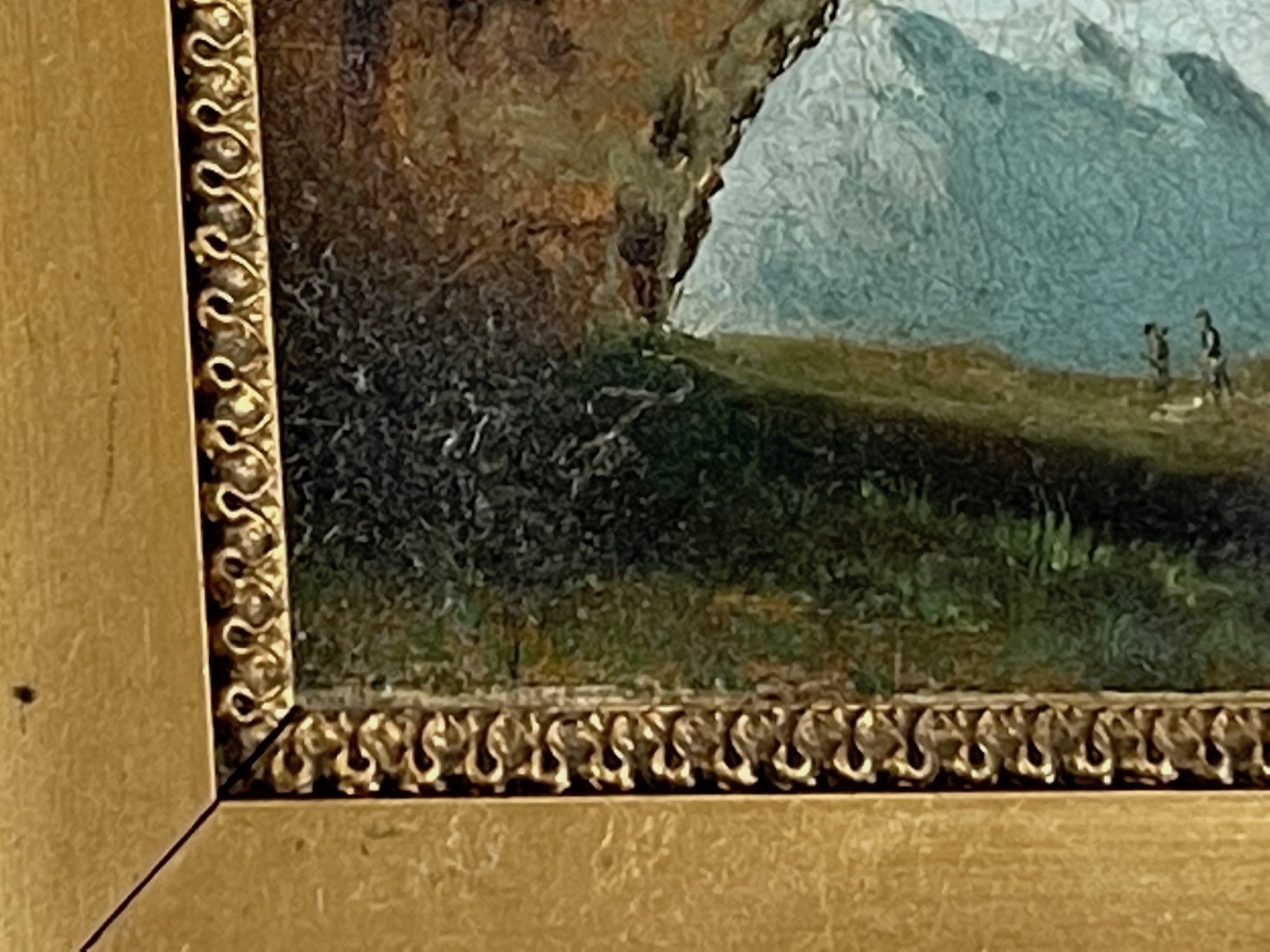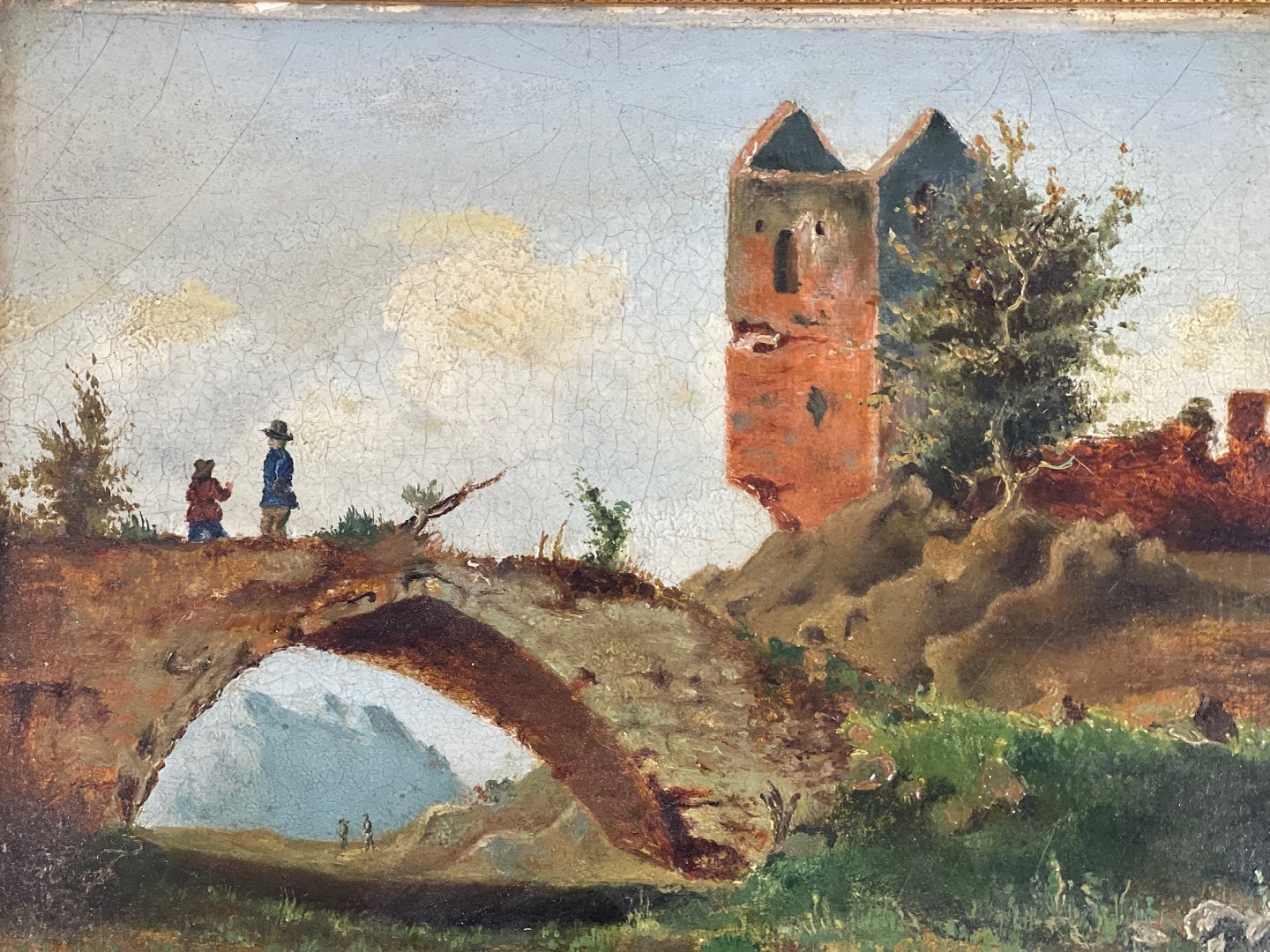 Landschaftsgemälde mit Brücke, Burgruine und Personen - möglicherweise Deutsche oder Österreicher - rückseitig mit Bleistift bezeichnet Hans Fischer, undeutlich mit Initialen in der unteren linken Ecke signiert.