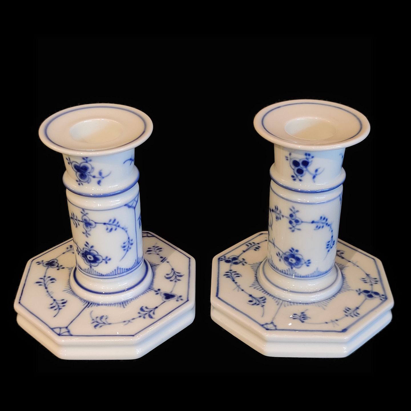 Text zugänglich auf Dänische: Royal Copenhagen, musselmalet riflet; Par lysestager i porcelæn #3303