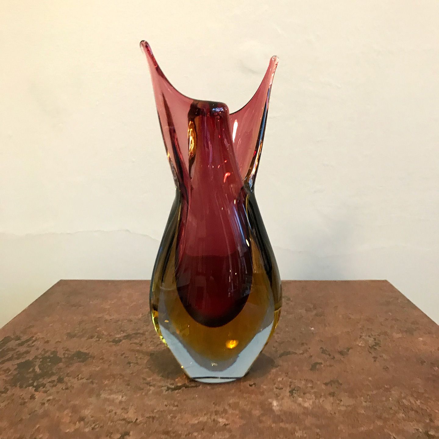 En venetiansk organisk glasvase af klart, rødlilla og gult glas. Udført på øen Murano, nær Venedig, Italien. Fremstillet i stil med Flavio Polis sommerso glasvarer til Seguso Vetri d'Arte.
