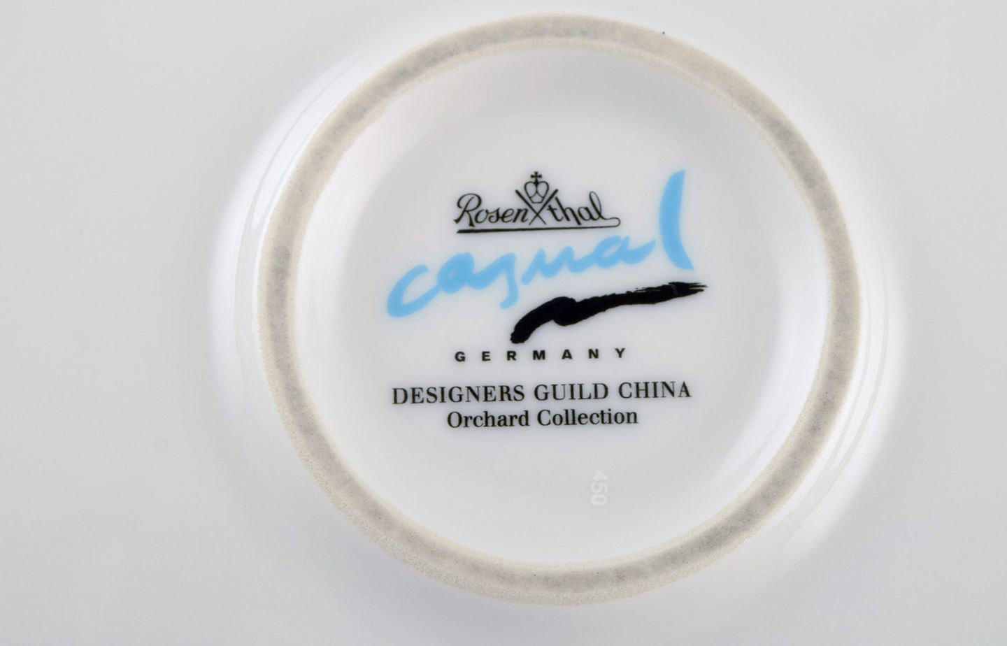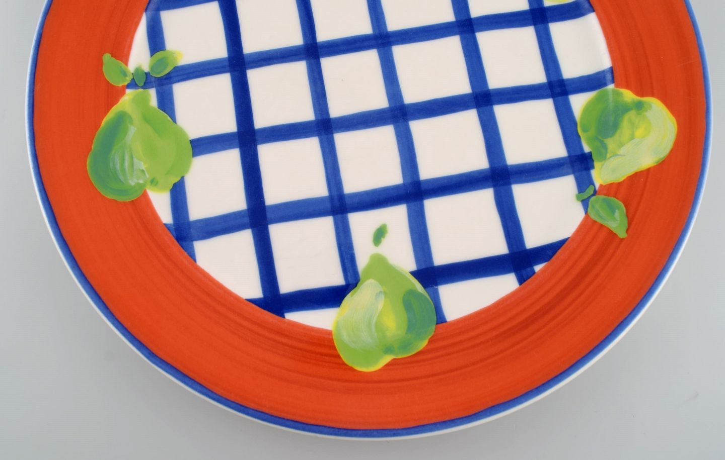 Rosenthal Designers Guild. Orchard Collection. Fire store dækketallerkener i porcelæn. Ternet design, rød kant og pærer. Sent 1900-tallet.