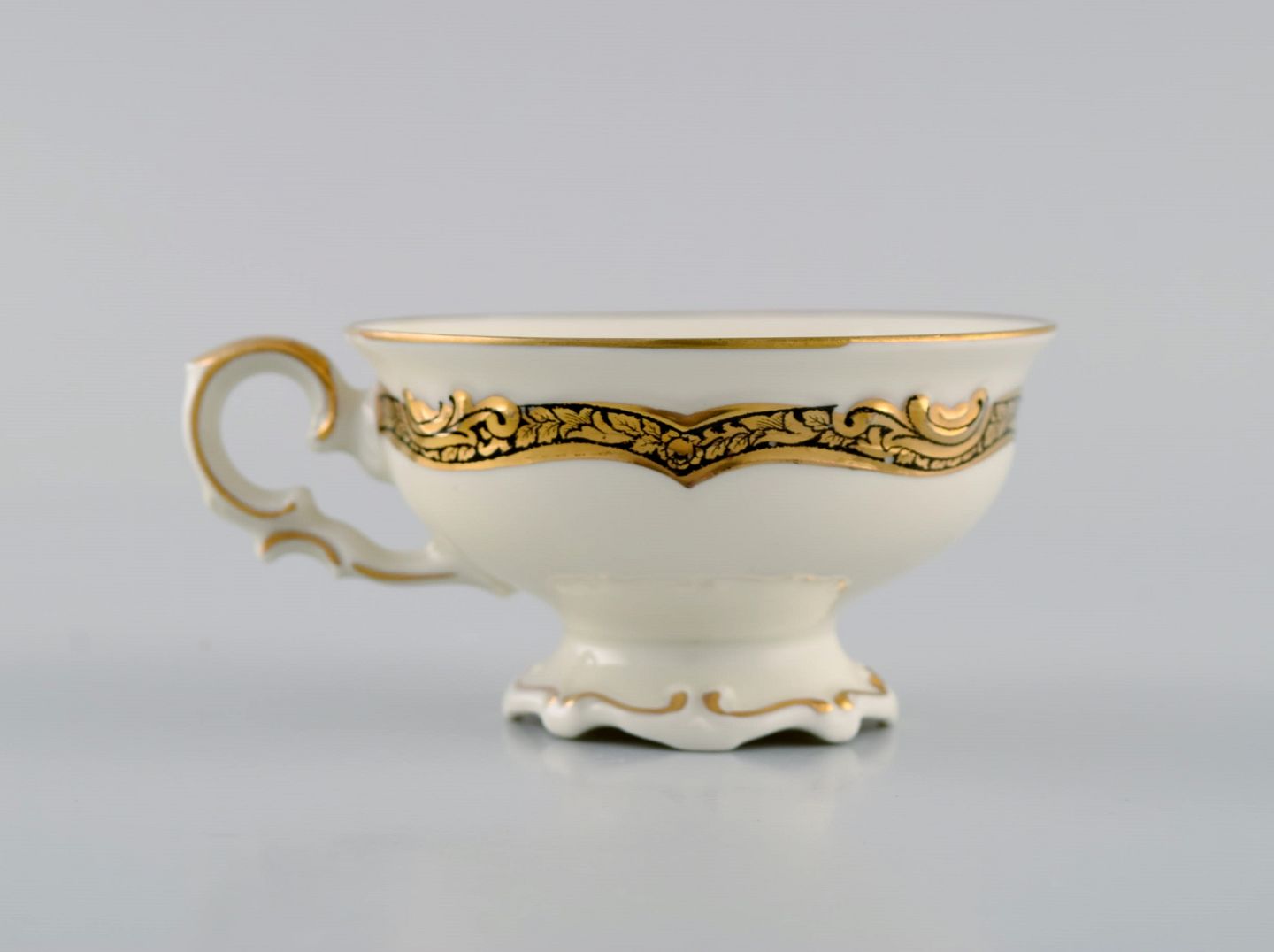Text zugänglich auf Dänische: KPM, Berlin. Tolv Royal Ivory tekopper med underkopper i cremefarvet porcelæn med gulddekoration. 1920'erne.