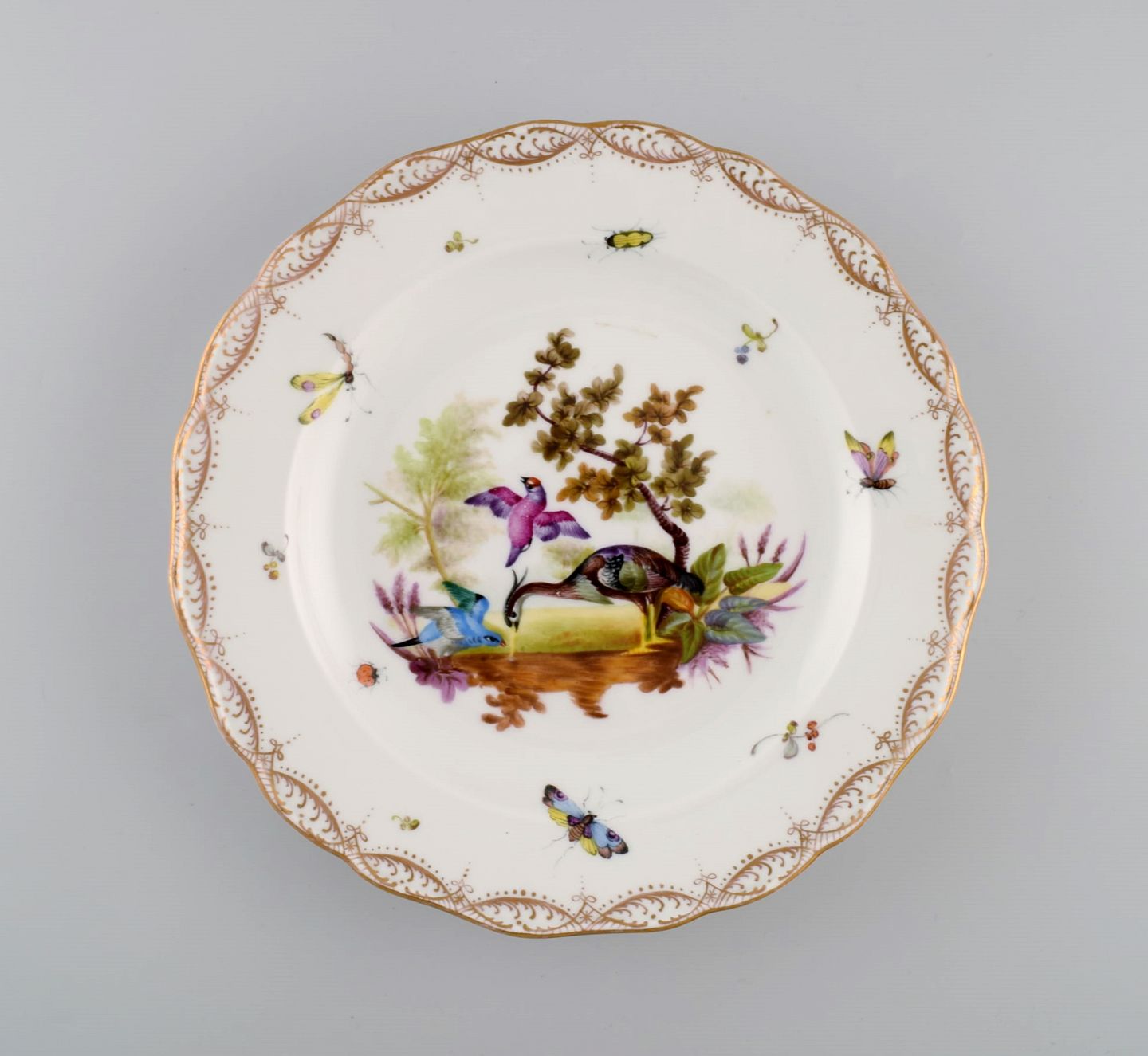 Text zugänglich auf Dänische: Antik og sjælden Meissen porcelænstallerken med håndmalede fugle, insekter og gulddekoration. 1800-tallet.