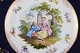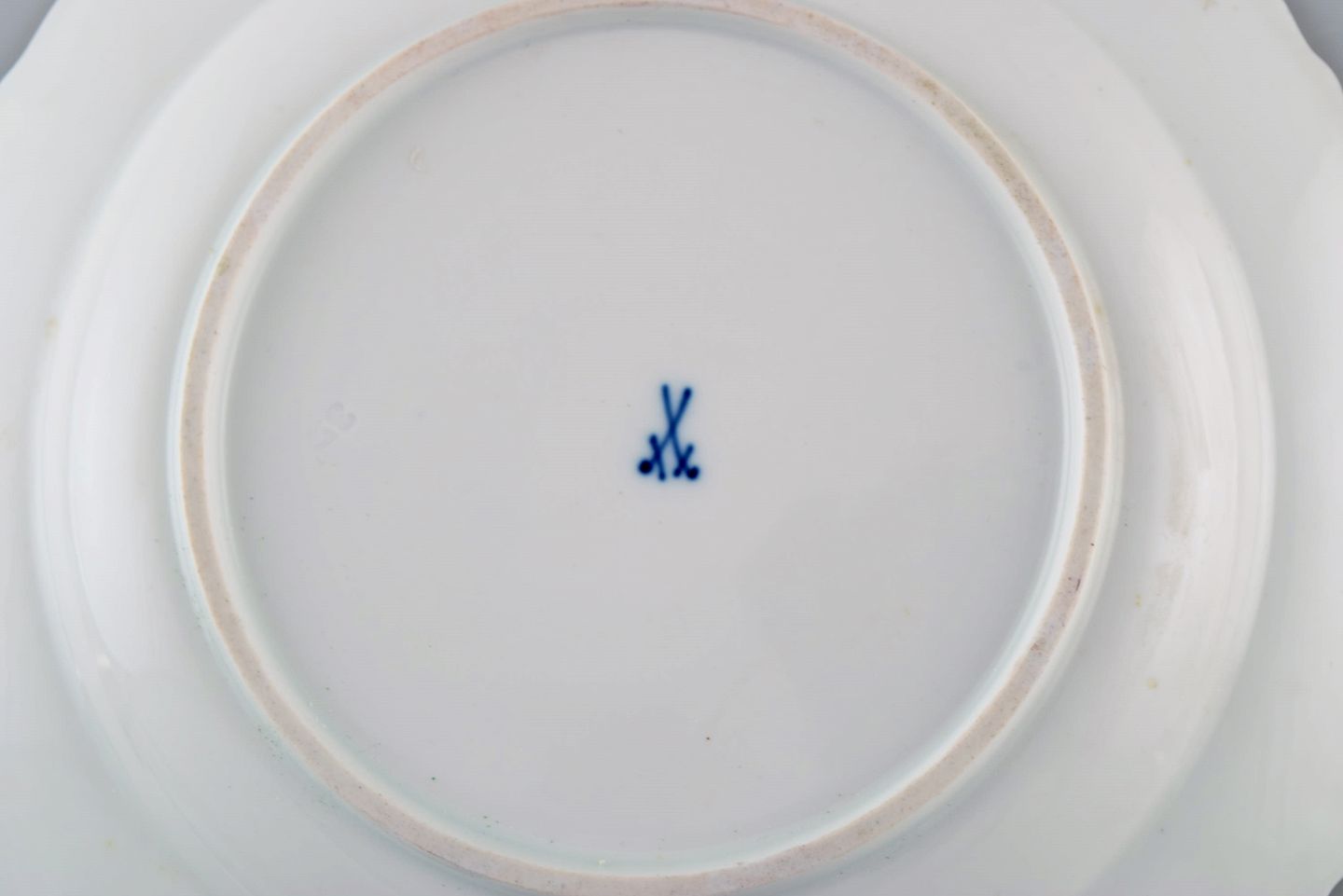 Text zugänglich auf Dänische: Antik Meissen tallerken i håndmalet porcelæn. Romantisk scene, blå kant med gulddekoration. Sent 1800-tallet.