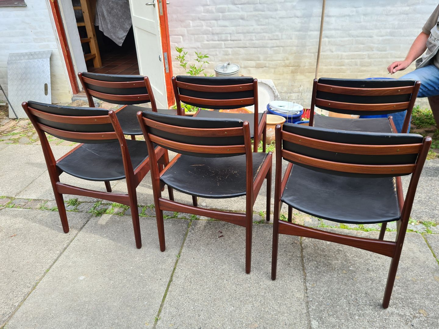 6 elegante spisebordsstole i teaktræ og sort læder. Fremstillet hos Frem Røjle møbelfabrik. Fremstår flotte og stabile med god patina.