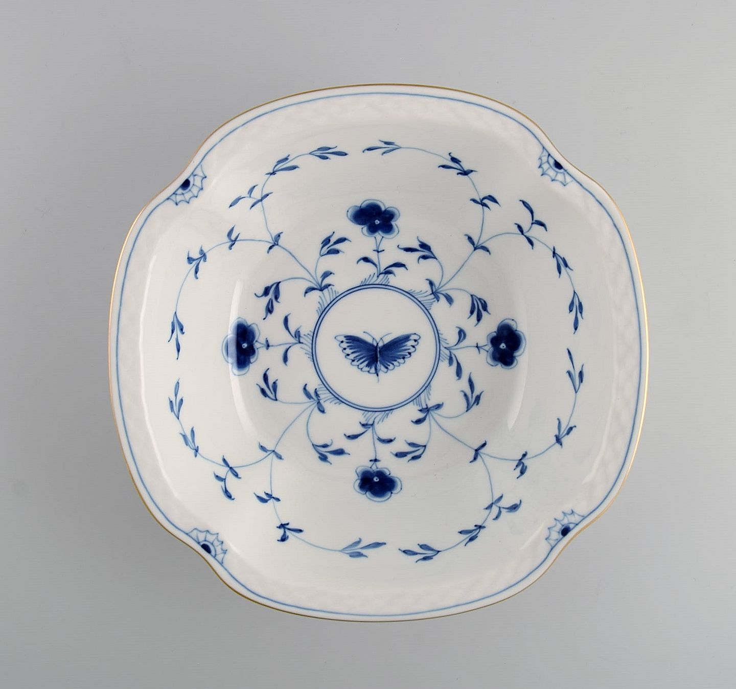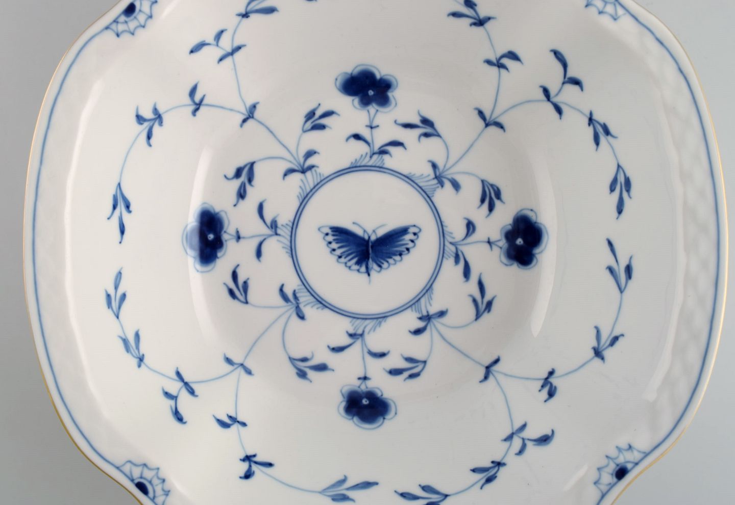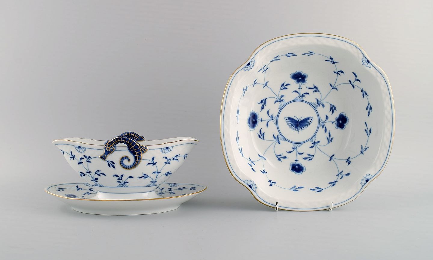 Bing & Grøndahl Sommerfugl sovsekande og skål i håndmalet porcelæn med guldkant. Midt 1900-tallet.