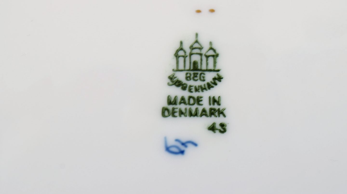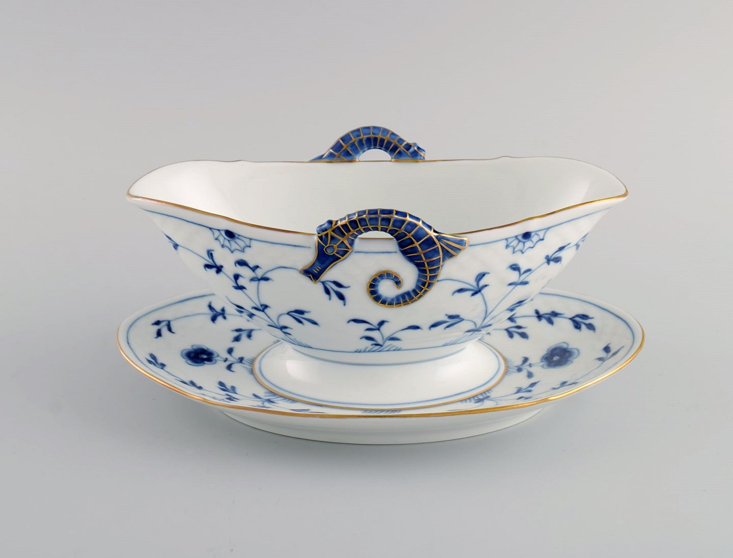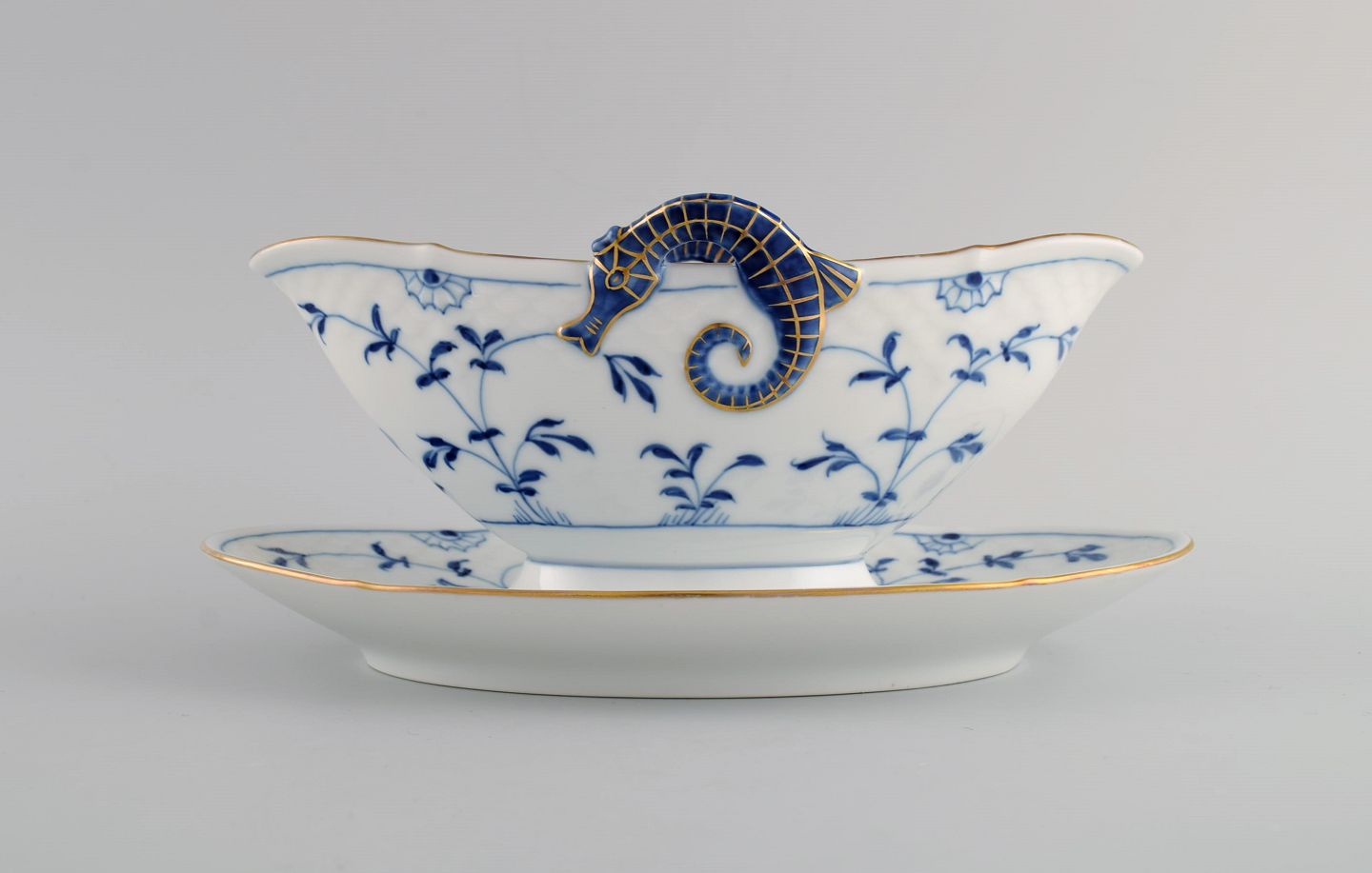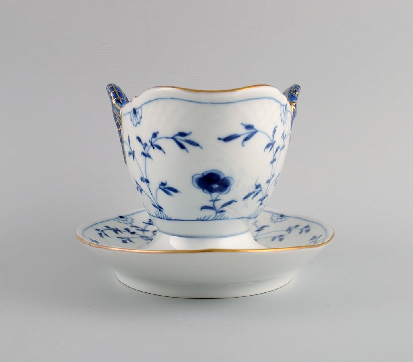 Bing & Grøndahl Sommerfugl sovsekande og skål i håndmalet porcelæn med guldkant. Midt 1900-tallet.