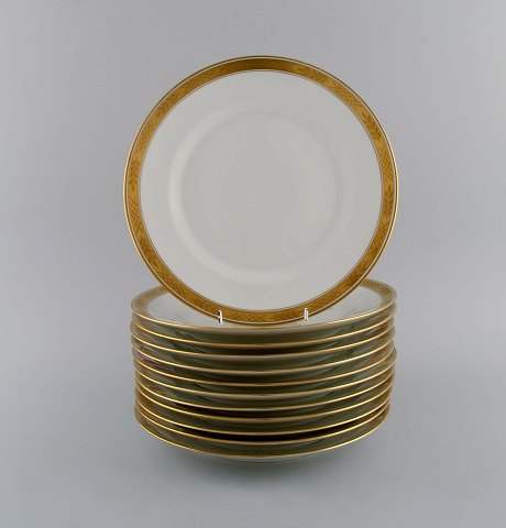 Royal Copenhagen stel nr. 607. Tolv middagstallerkener i porcelæn. Guldkant med bladværk. Modelnummer 607/9586. 1960'erne.