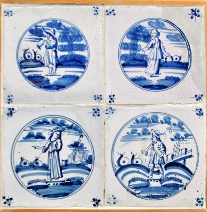 Fliesenfirpas, blau dekorierte Fliesen mit Landschaften mit Menschen, Niederlande des 19. Jahrhunderts. Mit Eckverzierungen in Form von Spinnen. 13 x 13 cm.
