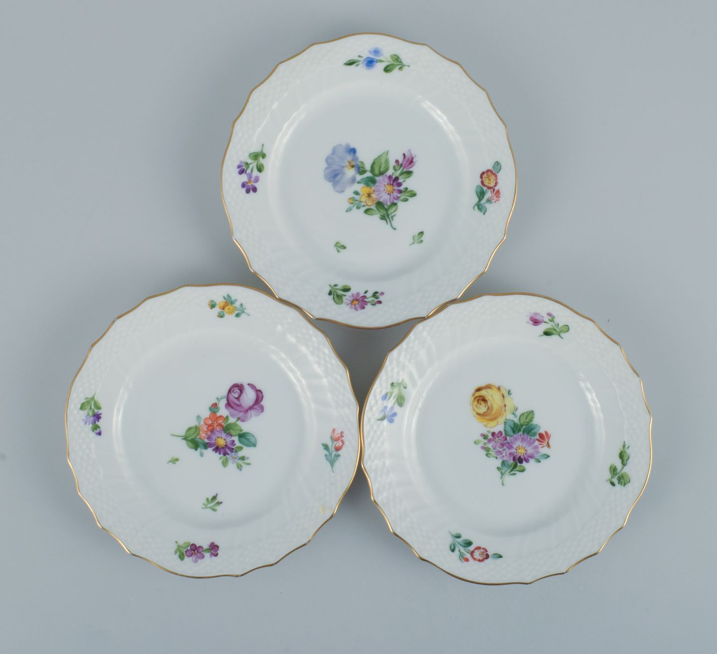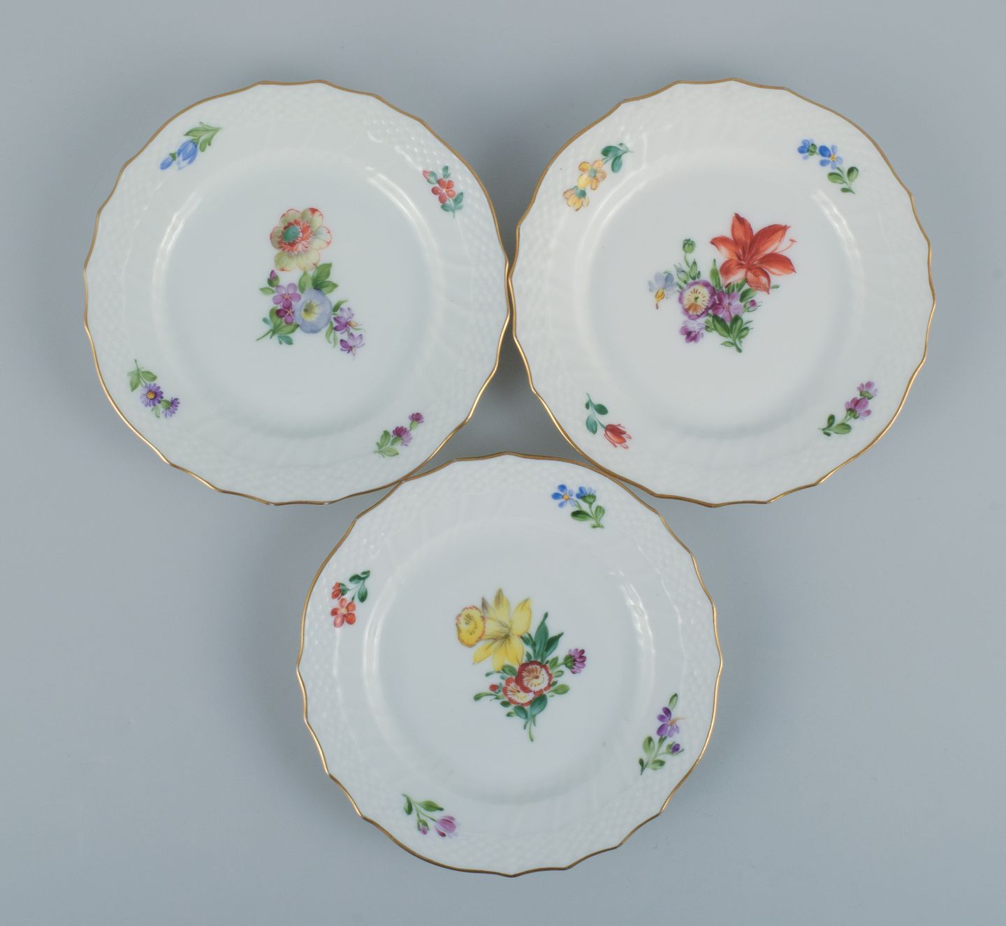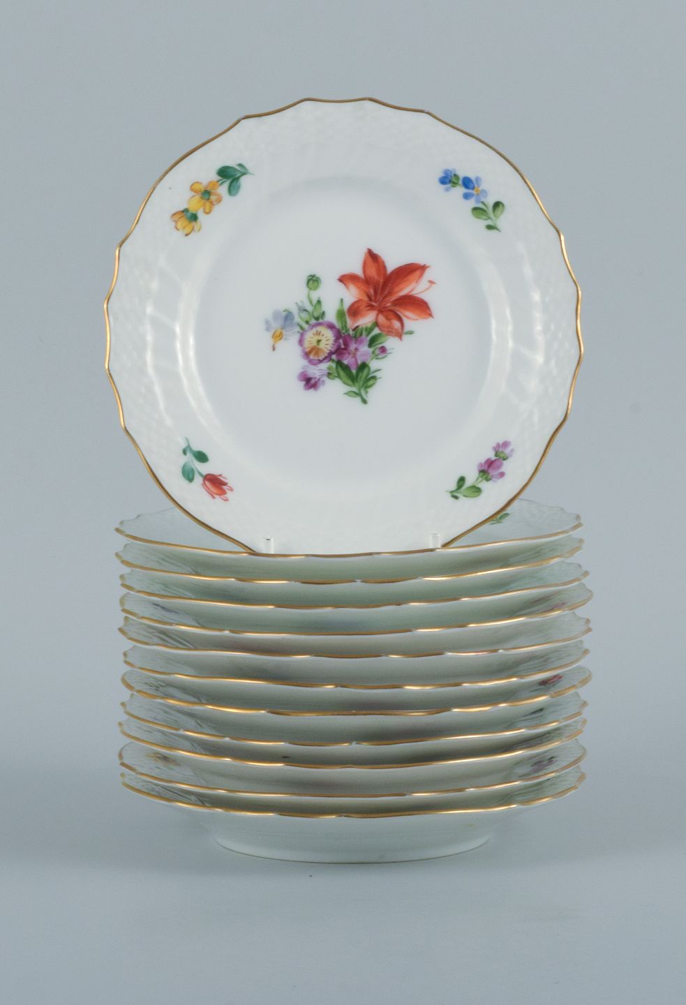 Tolv tallerkner af porcelæn, dekoreret i farver og guld med blomster.