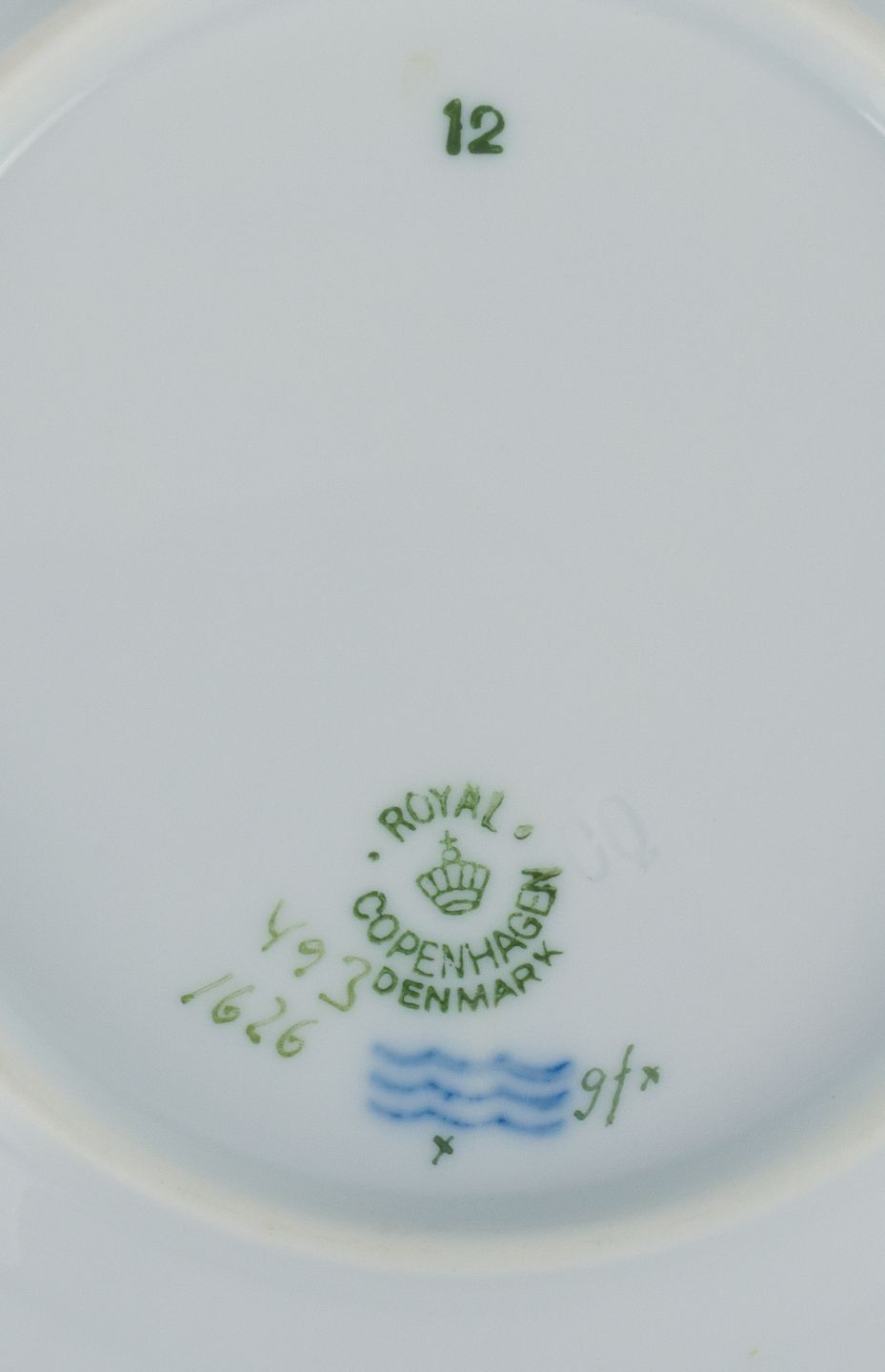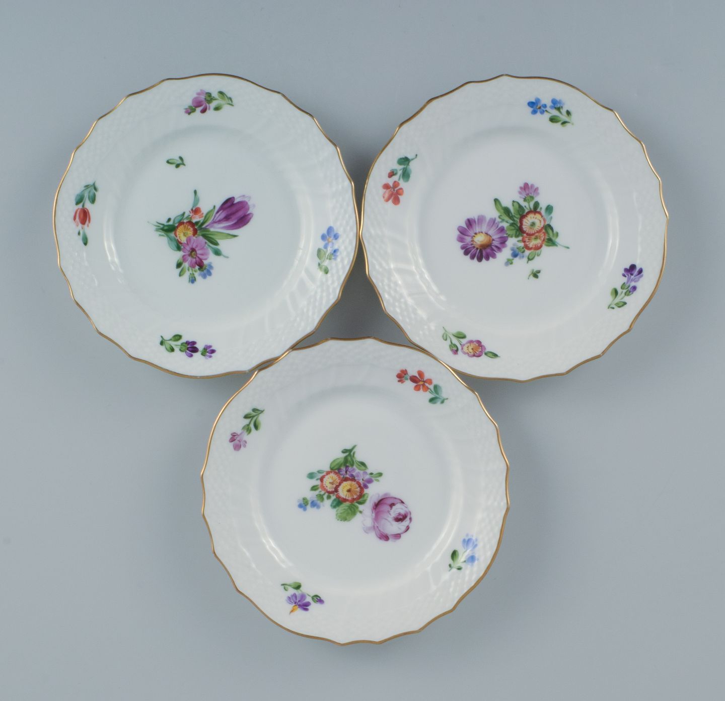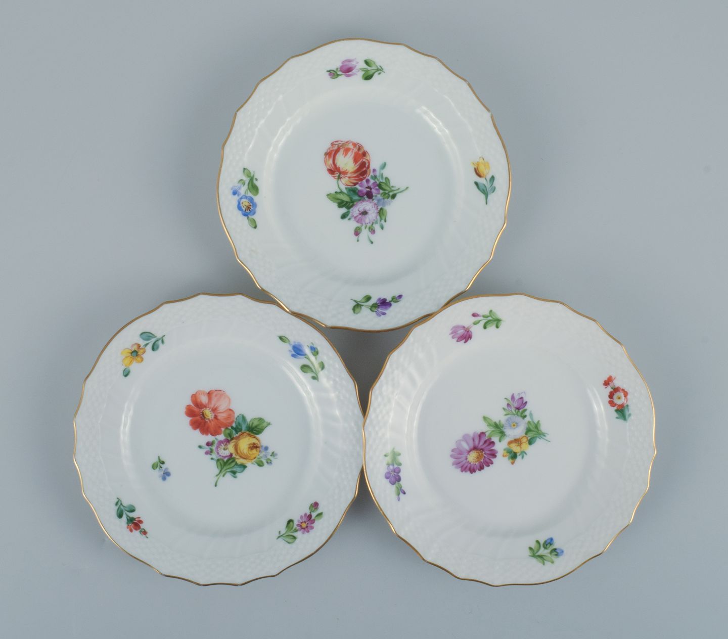 Tolv tallerkner af porcelæn, dekoreret i farver og guld med blomster.