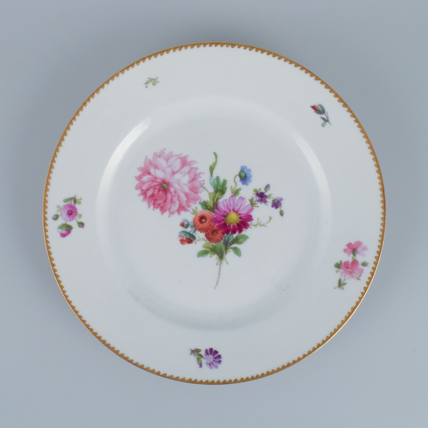 Text zugänglich auf Dänische: Bing & Grøndahl, seks middagstallerkner saksisk blomst, håndmalet med blomstermotiver i polykrome farver og guldkant.