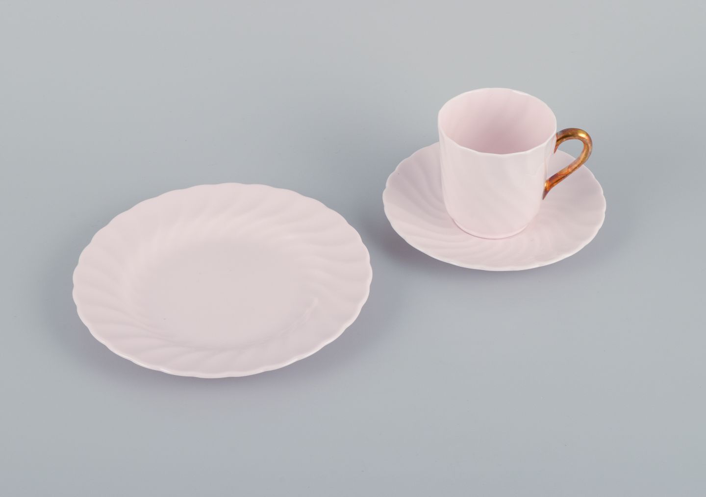 Text zugänglich auf Dänische: Tuscan, England, fempersoners kaffeservice i lyserødt porcelæn med gulddekoration.