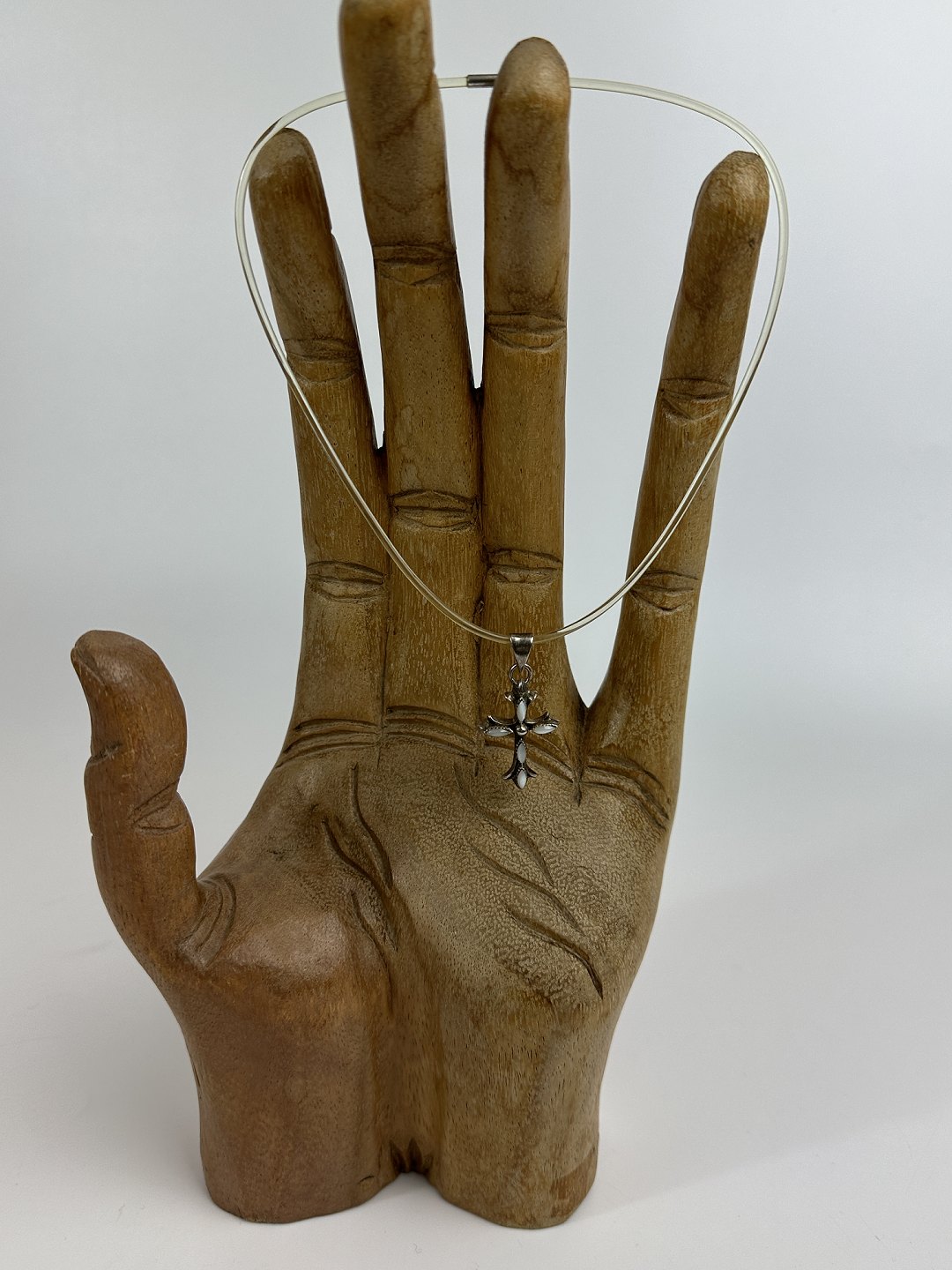 | Vintage Silberkreuz mit transparenter "Kette" aus Naturkautschuk und Silberschloss. Das Kreuz misst insgesamt 4,20 Zentimeter in der Höhe. Etwa 2 cm breit. Sie ist mit 925 gestempelt. Die Länge der Kette beträgt ca. 39 cm.