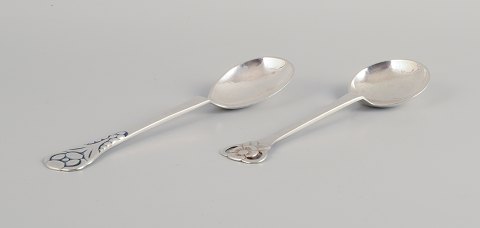 Text zugänglich auf Dänische: Evald Nielsen, dansk sølvsmed, to store skønvirke hammerslået sukkerskeer i tretårnet sølv.