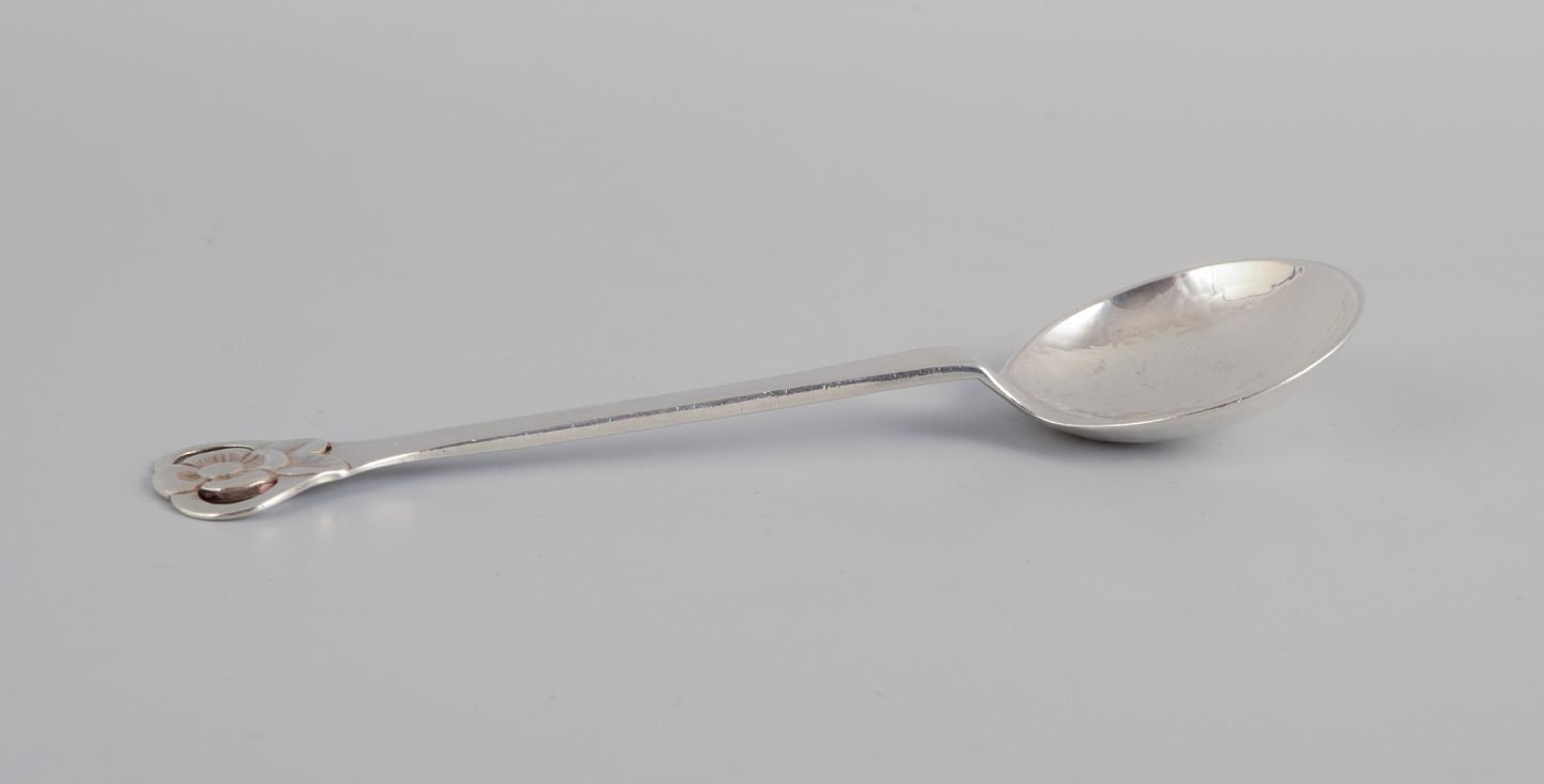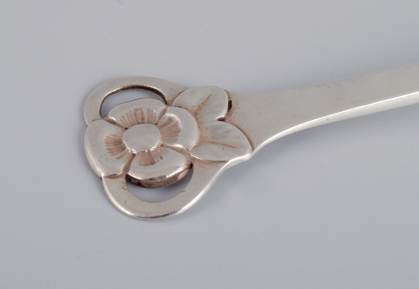 Text zugänglich auf Dänische: Evald Nielsen, dansk sølvsmed, to store skønvirke hammerslået sukkerskeer i tretårnet sølv (830).