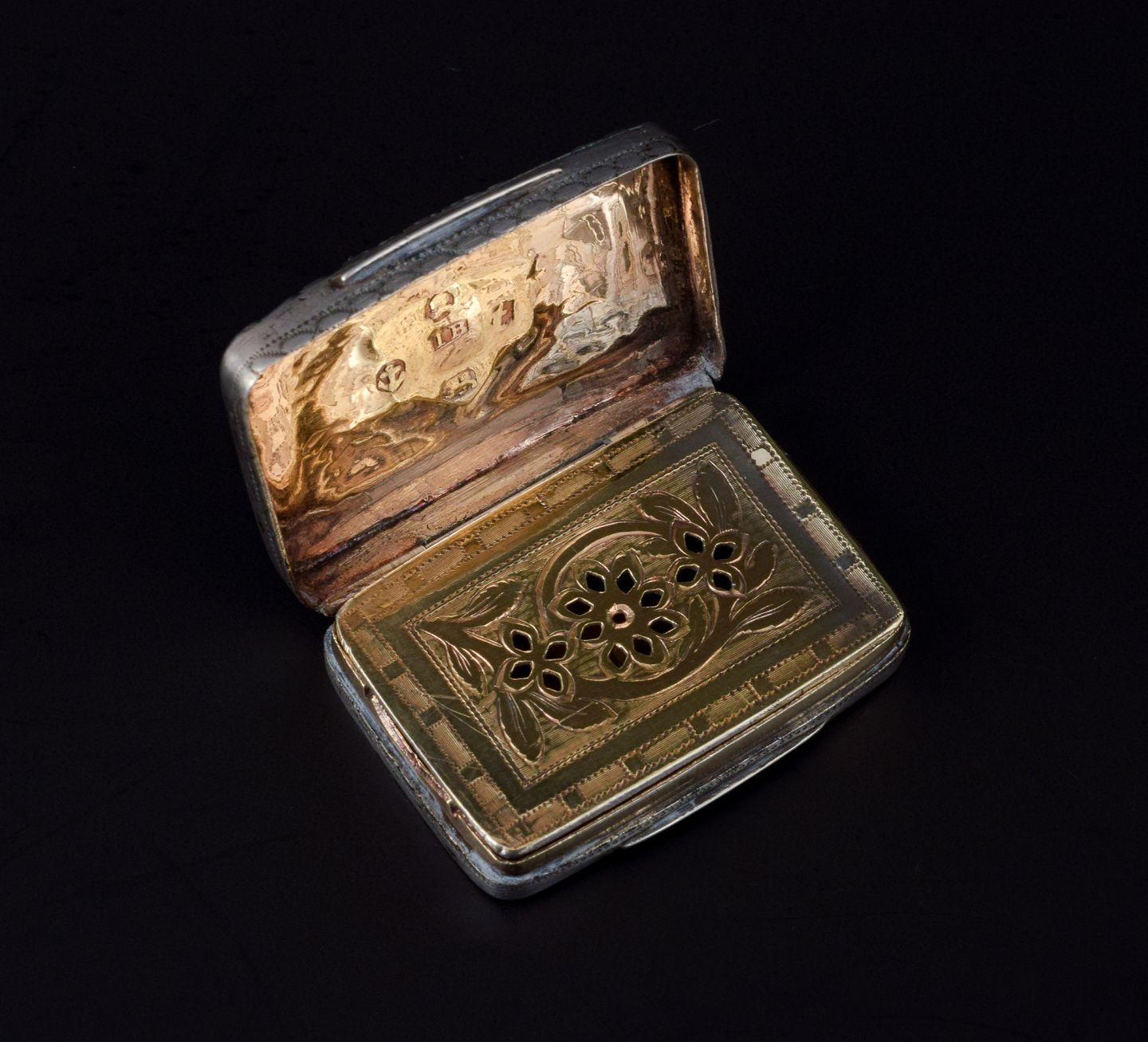 Antik miniature pilleæske i sølv, indvendigt forgyldt.